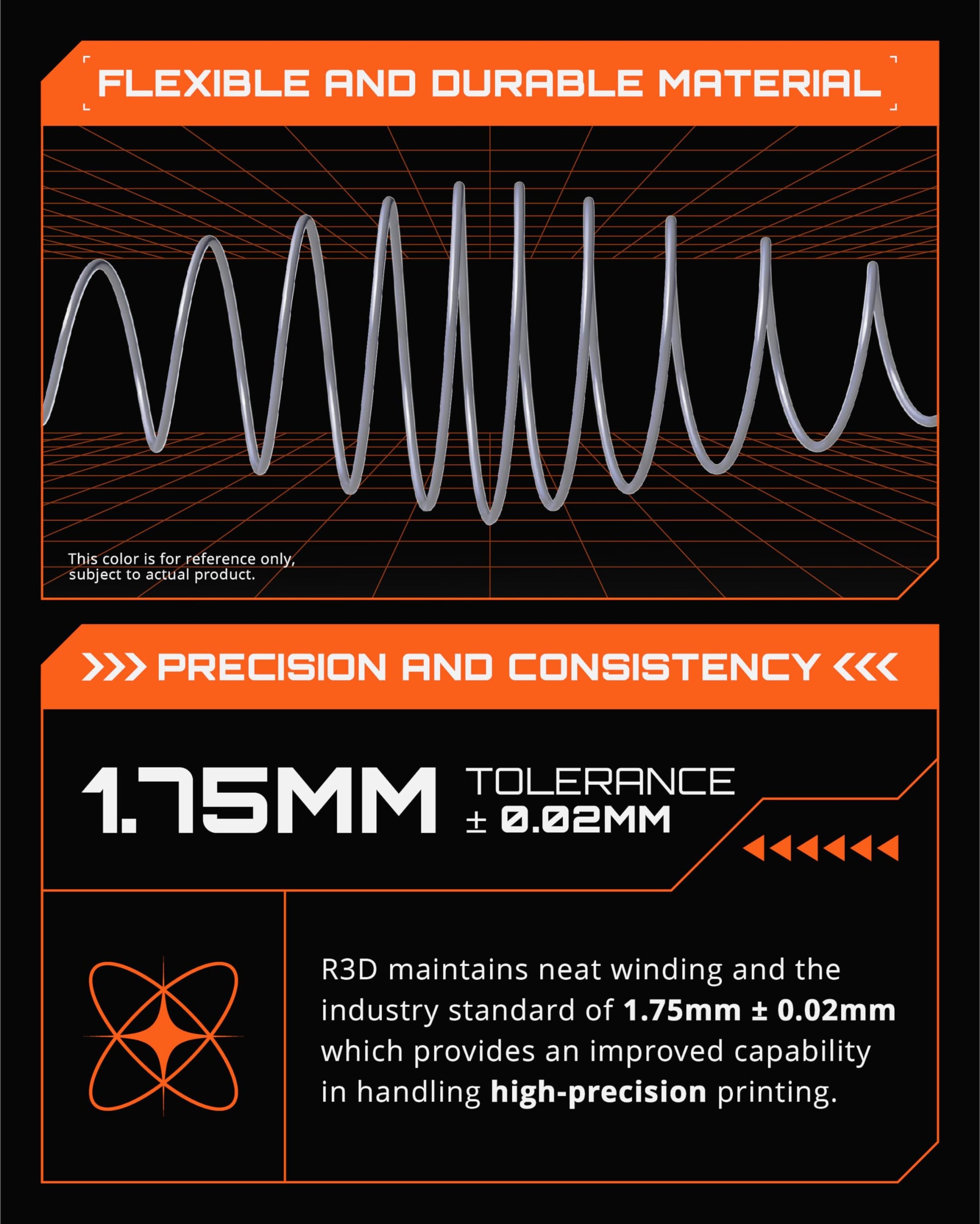 - 【PLA with Outstanding Blend of Impact Resilience and Stiffness】 – The R3D PLA filament is 1.6 times more rigid than other 1.75mm toughened PLA filaments.