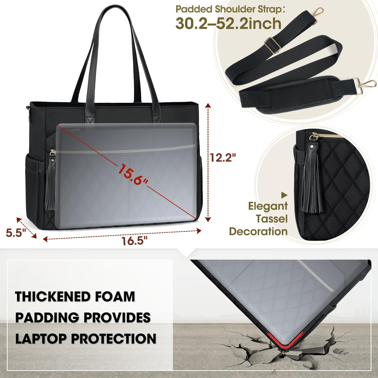 - Perfect Size Laptop Bag: The laptop bags for women measures 16.5"*5.5"*12.2"/42cm*14cm*31cm (L*W*H). Net weight: 0.755KG.Adjustable shoulder strap length 30.2-52.2inch.Fits most laptops up to 15.6",Thick foam padding inside the computer compartment better protects your laptop from bumps and bruises. Our perfect size womens laptop bag is not only for the office, but also seamlessly transitions from work to after-work events, suitable for meetings, presentations.