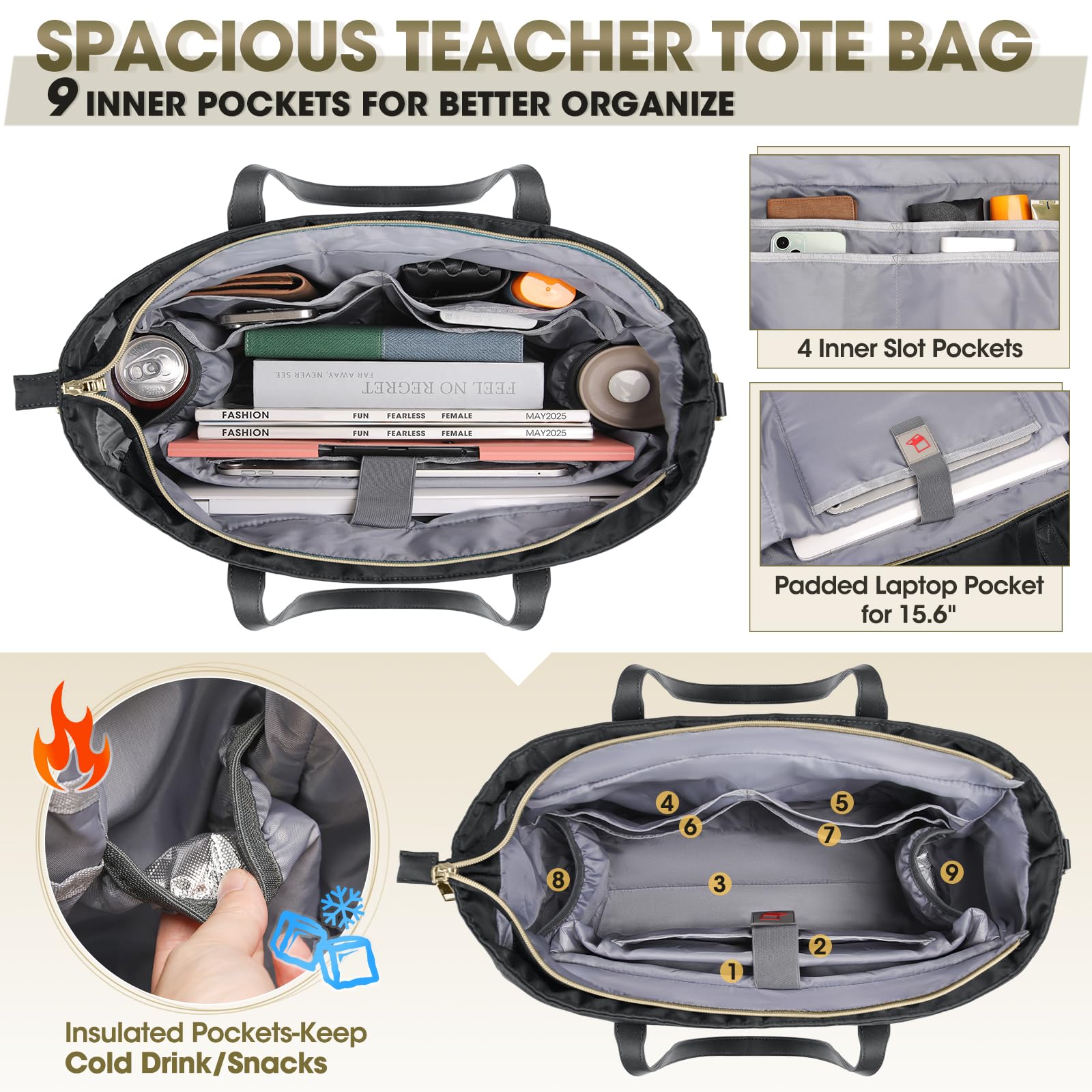 - Multi-Pocket Design: Work bag women made with zipper sticker closure, main compartment compartment with laptop sleeve + ipad insert pocket on the back panel, 4 open pockets on the front panel, insulated aluminum foil insert pockets on the left and right sides; briefcase front with 1 large inside front zipper hidden pocket, 1 large front zipper pocket, 1 zipper pocket on the back panel of the bag, 2 side pockets; work tote bags women multi-pocket design Ensure your belongings are well organized.