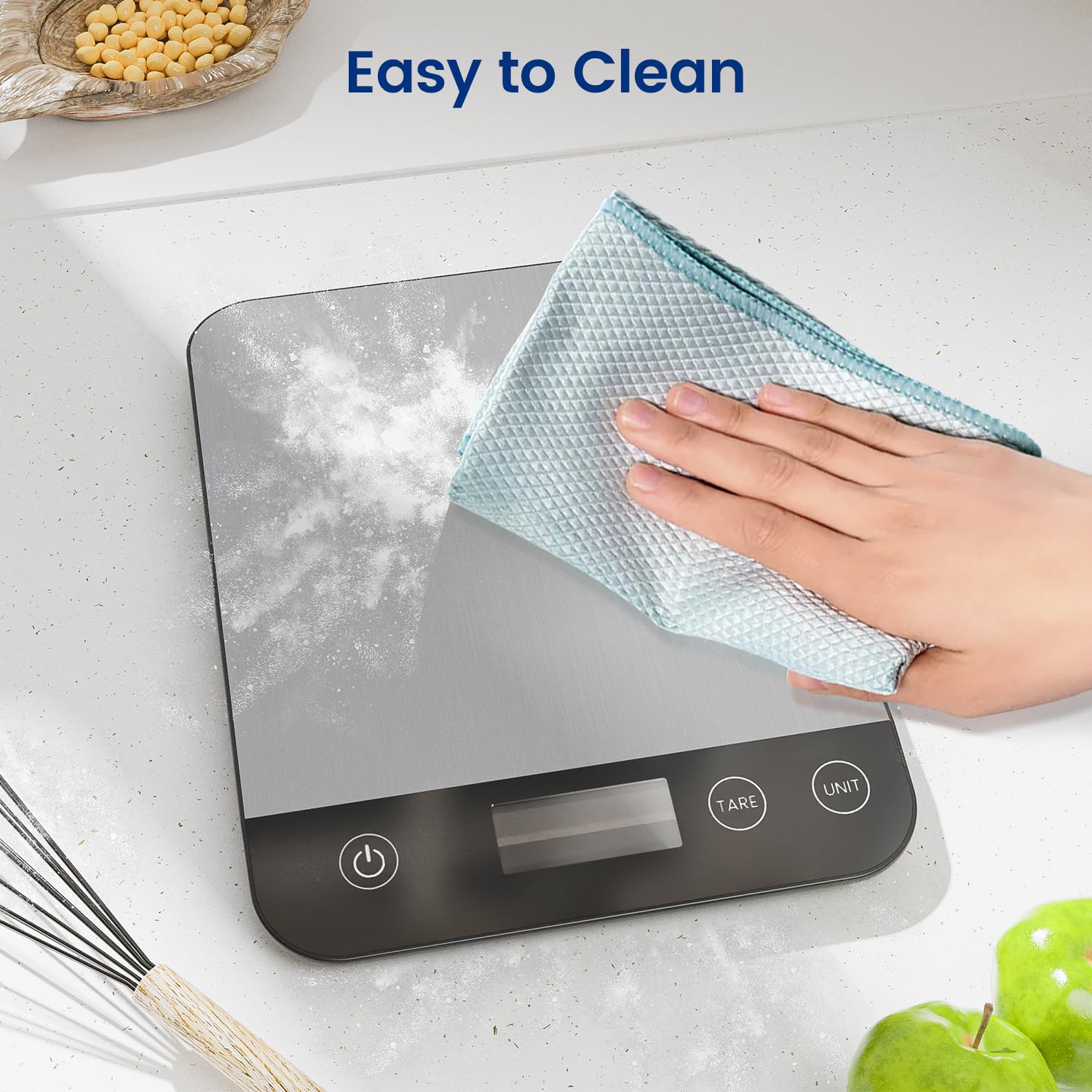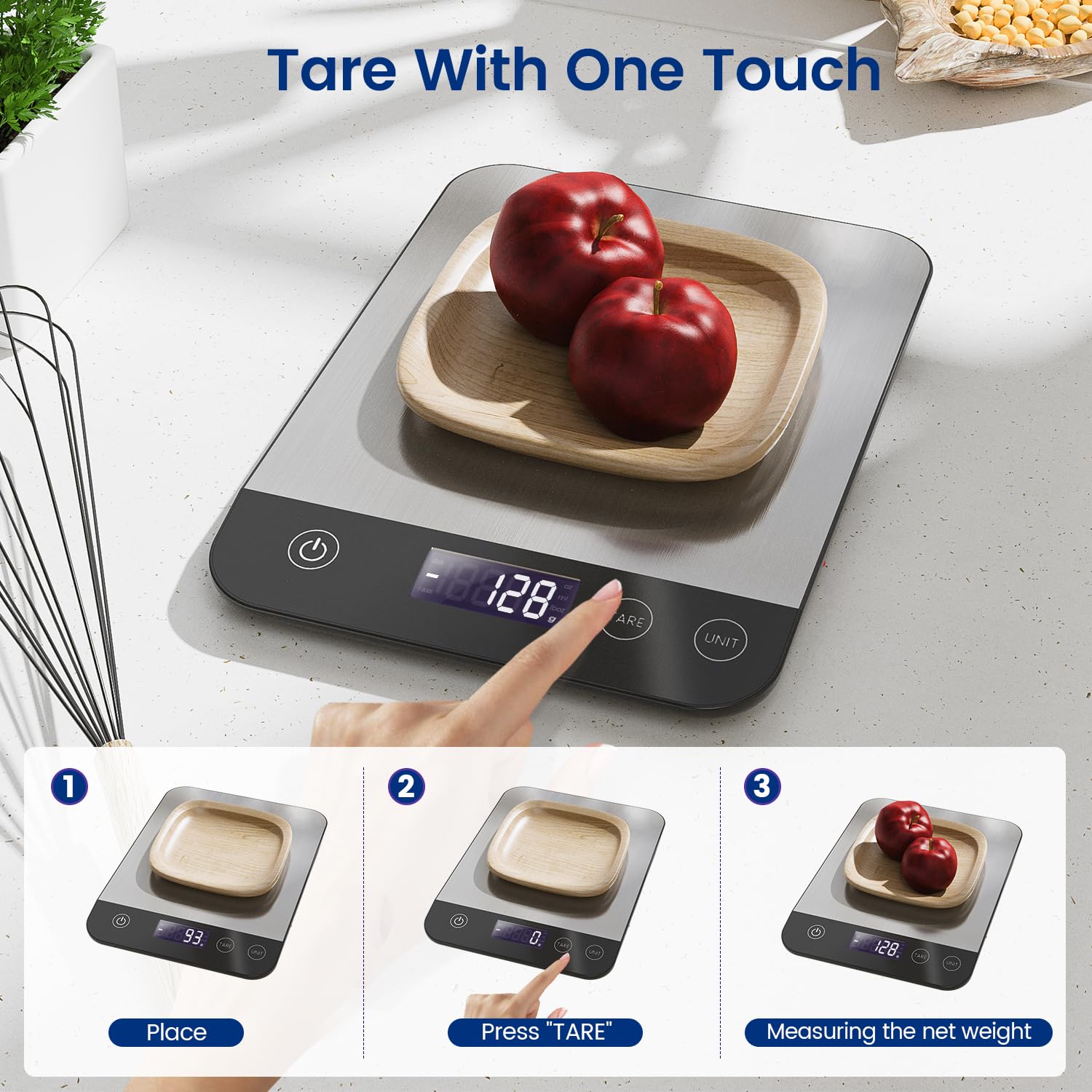 - The digital food scale has a convenient TARE function that allows you to subtract the weight of the container to get accurate measurements of your ingredients. This is especially useful when weighing liquids or powders.
