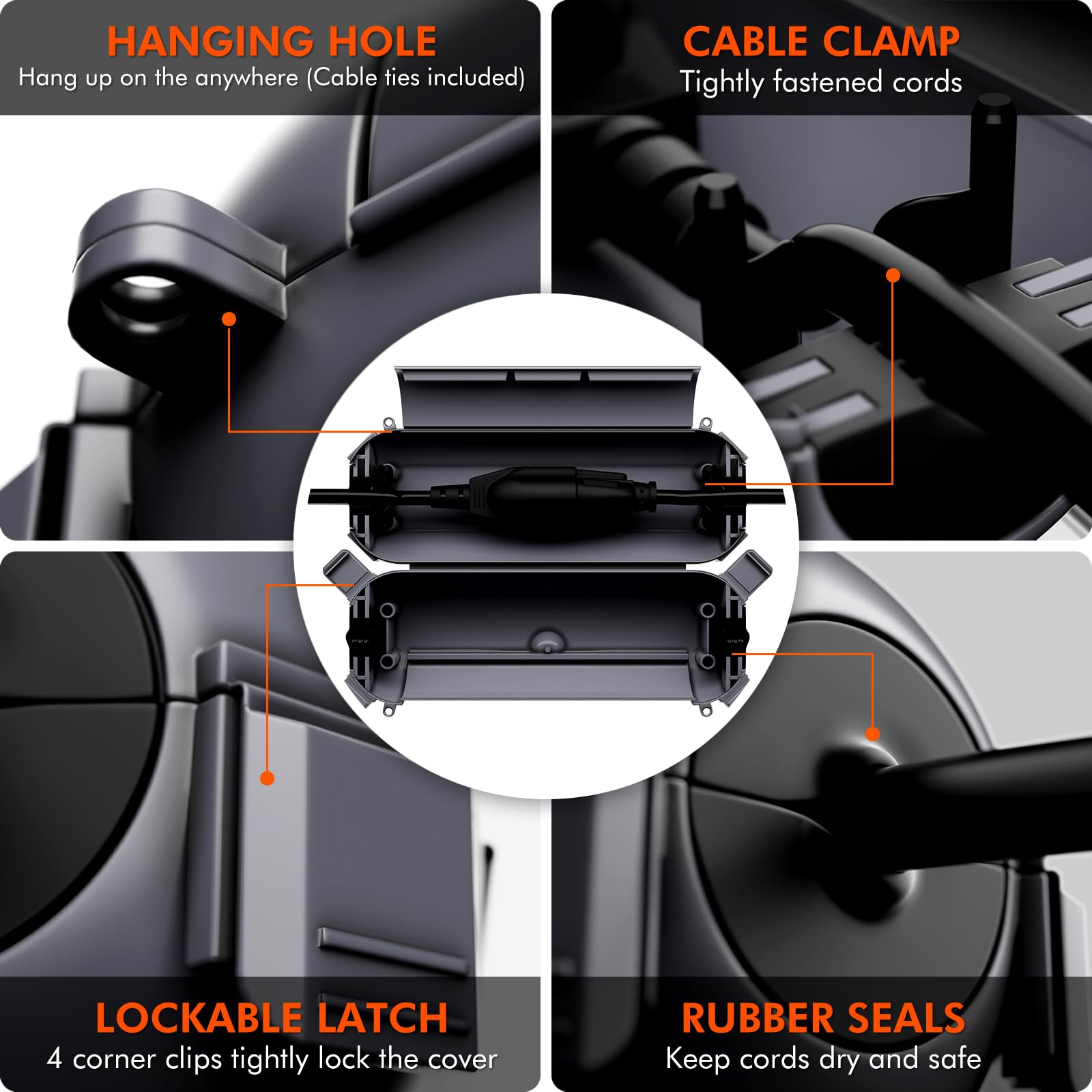 - Upgraded Extension Cord Safety Cover: With 4 lockable latches, 2 cable clamps, 2 mounting holes and 2 cable ties, it creates a watertight sealing space, keeps outdoor & indoor electric connection dry and safety, easy to place and hang anywhere.