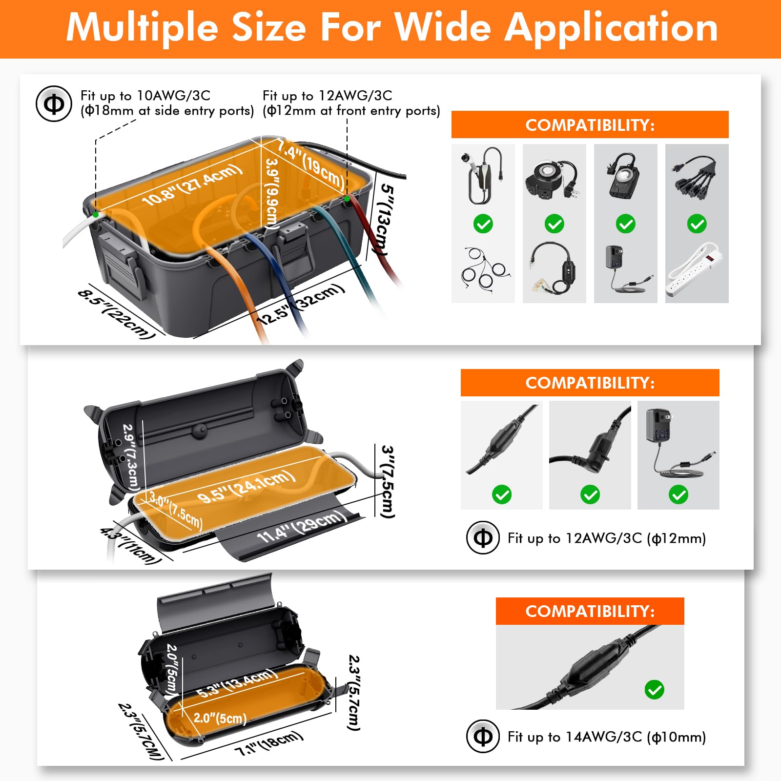 - Mini Size Electrical Box: Compact dimension (7 x 2 x 2 inches) and light weight (3 ounces), no more drop when hanging up the housing case in the air. Widely compatible with up to AWG14 cord, flat cable and braided wire.