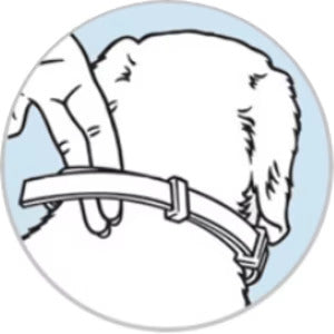 Use the 2-finger rule: insert the end of the collar through the buckle, then adjust the collar so that it is possible to hold two fingers comfortably between the collar and the neck.