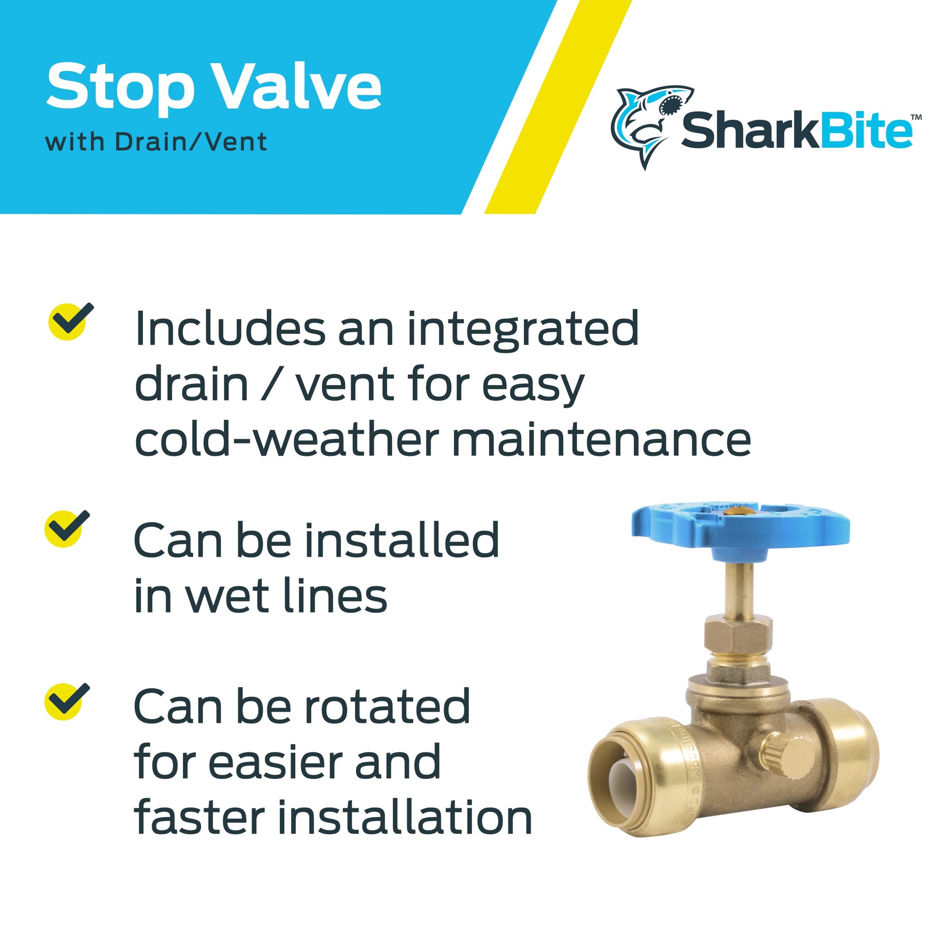 - The sharkbite push-to-connect stop valve is available in 1/2″ and 3/4″