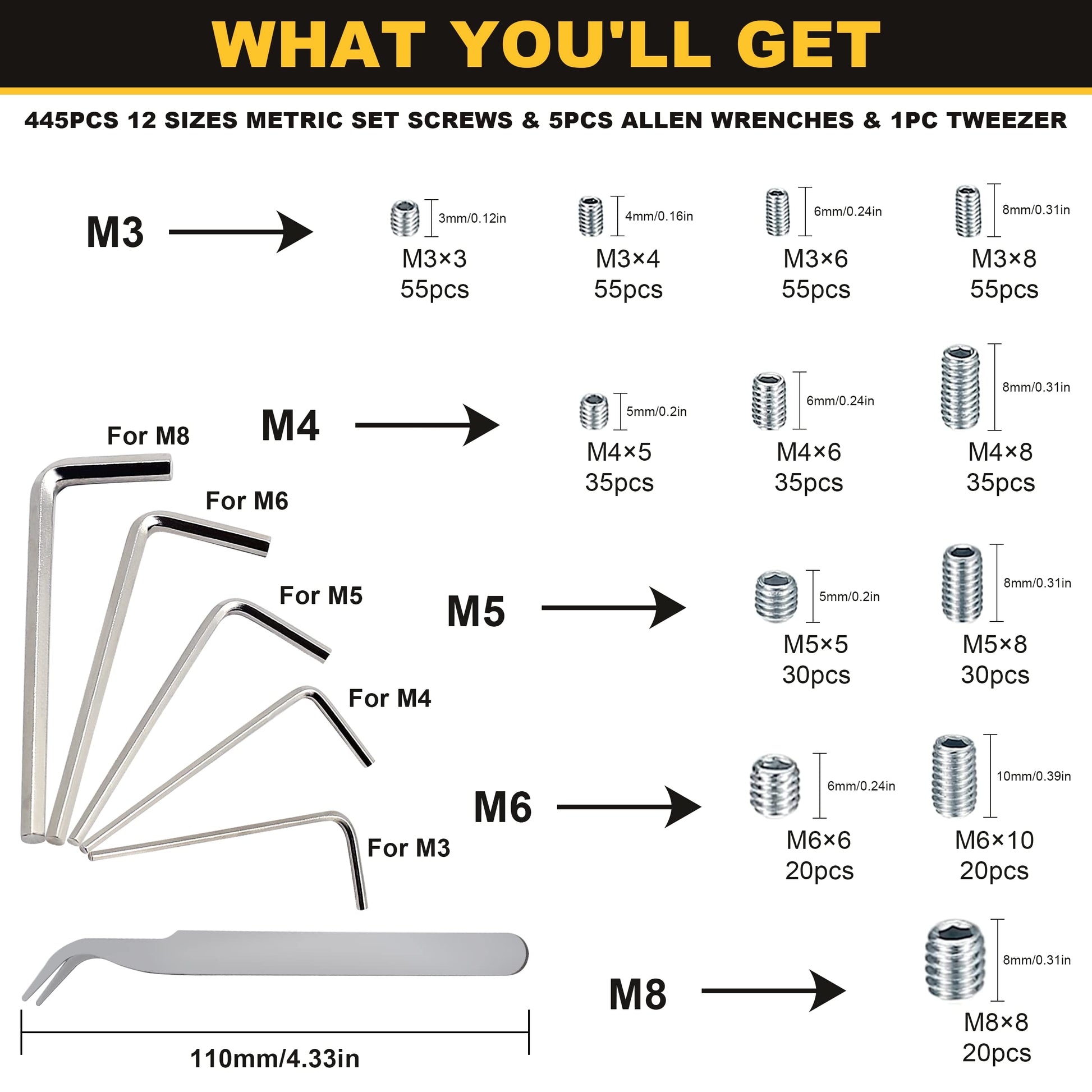 - SIPTENK 12 SIZES METRIC SET SCREWS: M3×3mm 55pcs, M3×4mm 55pcs, M3×6mm 55pcs, M3×8mm 55pcs; M4×5mm 35pcs, M4×6mm 35pcs, M4×8mm 35pcs; M5×5mm 30pcs, M5×8mm 30pcs; M6×6mm 20pcs; M6×10mm 20pcs; M8×8mm 20pcs; 445pcs set screw assortment & 5pcs Metric hex wrenches included.