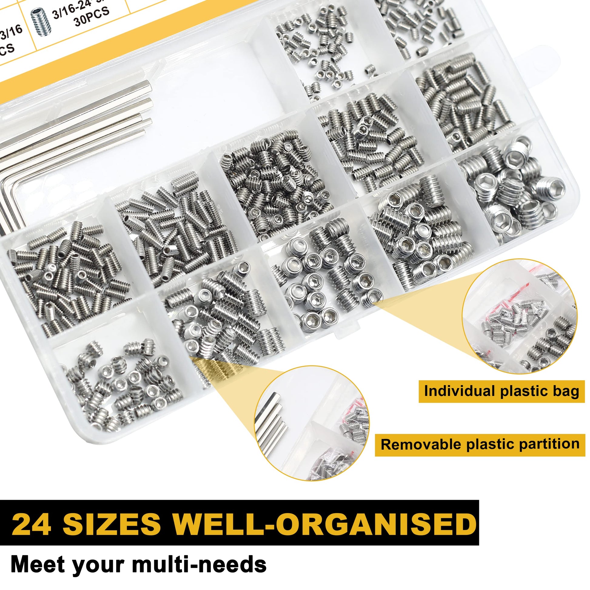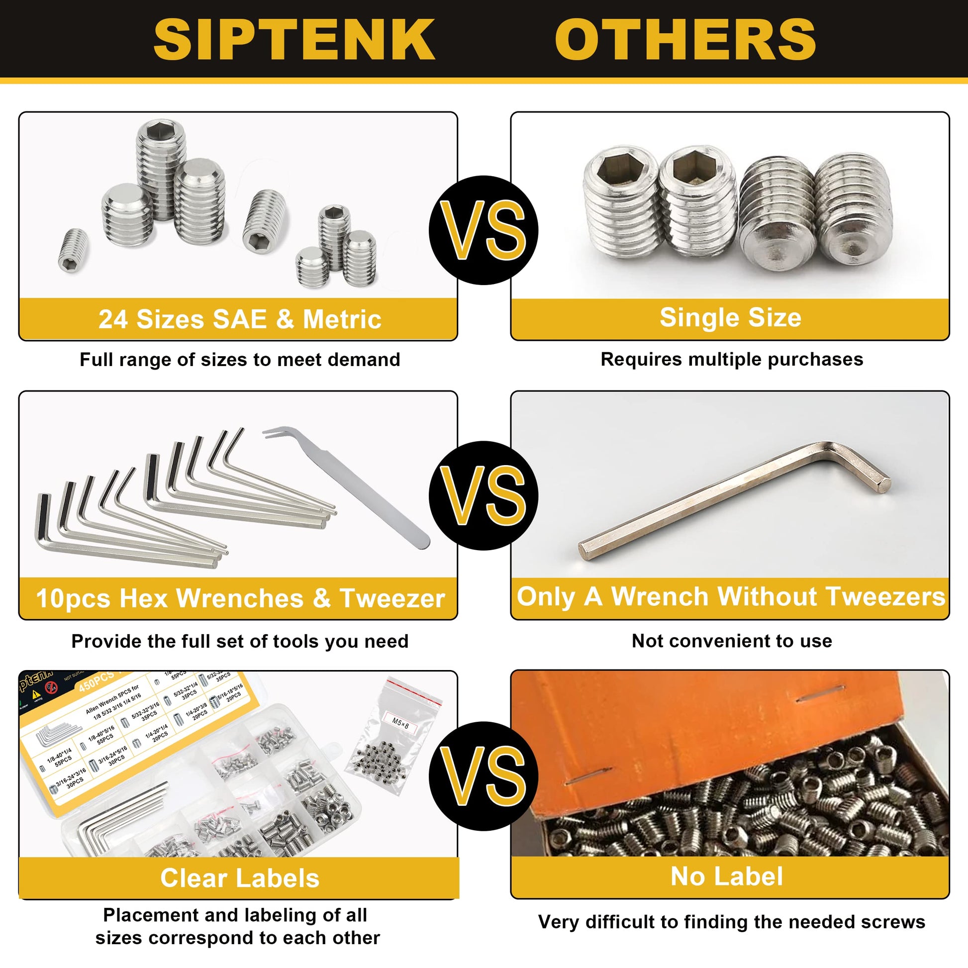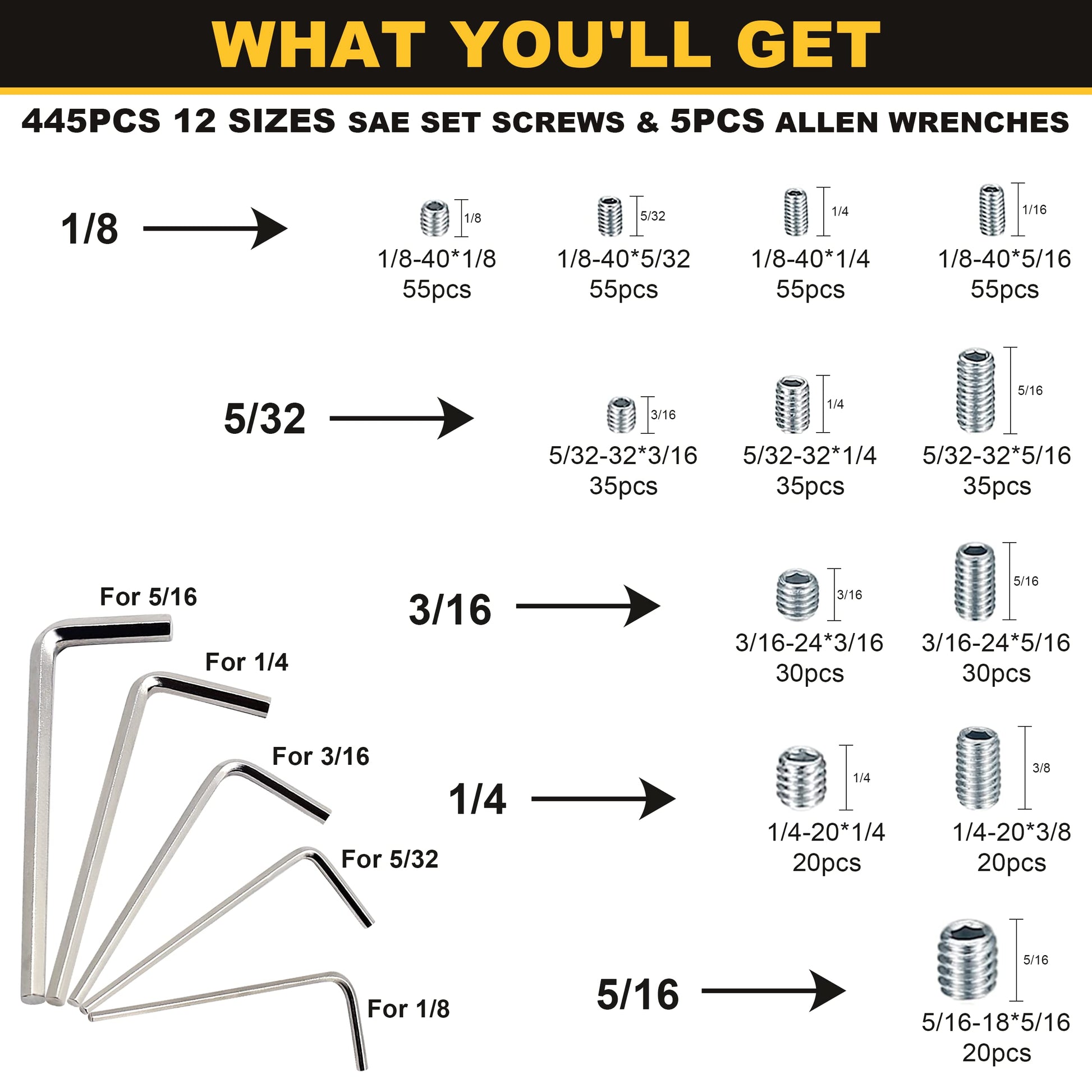 - SIPTENK 12 SIZES STANDARD SAE SET SCREWS: 1/8"-40*1/8" 55pcs, 1/8"-40*5/32" 55pcs, 1/8"-40*1/4" 55pcs, 1/8"-40*5/16" 55pcs; 5/32"-32*3/16" 35pcs, 5/32"-32*1/4" 35pcs, 5/32"-32*5/16" 35pcs; 3/16"-24*3/16" 30pcs, 3/16"-24*5/16" 30pcs; 1/4"-20*1/4" 20pcs, 1/4"-20*3/8" 20pcs; 5/16"-18*5/16" 20pcs; 445pcs set screw assortment & 5pcs SAE hex wrenches included.