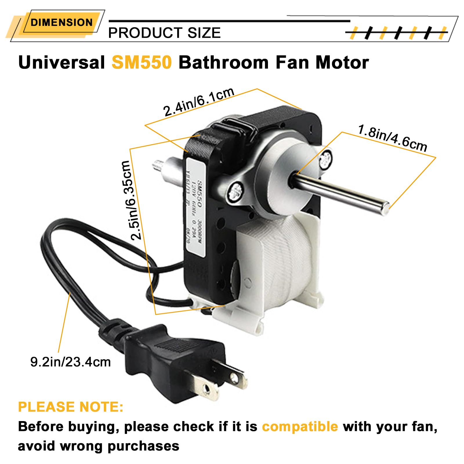 - Shaft & Wire Specifications: The motor includes a 3/16" x 1 3/4" shaft and a 6" wire with a 2-prong plug, ensuring easy installation and compatibility with most bathroom exhaust fan systems.