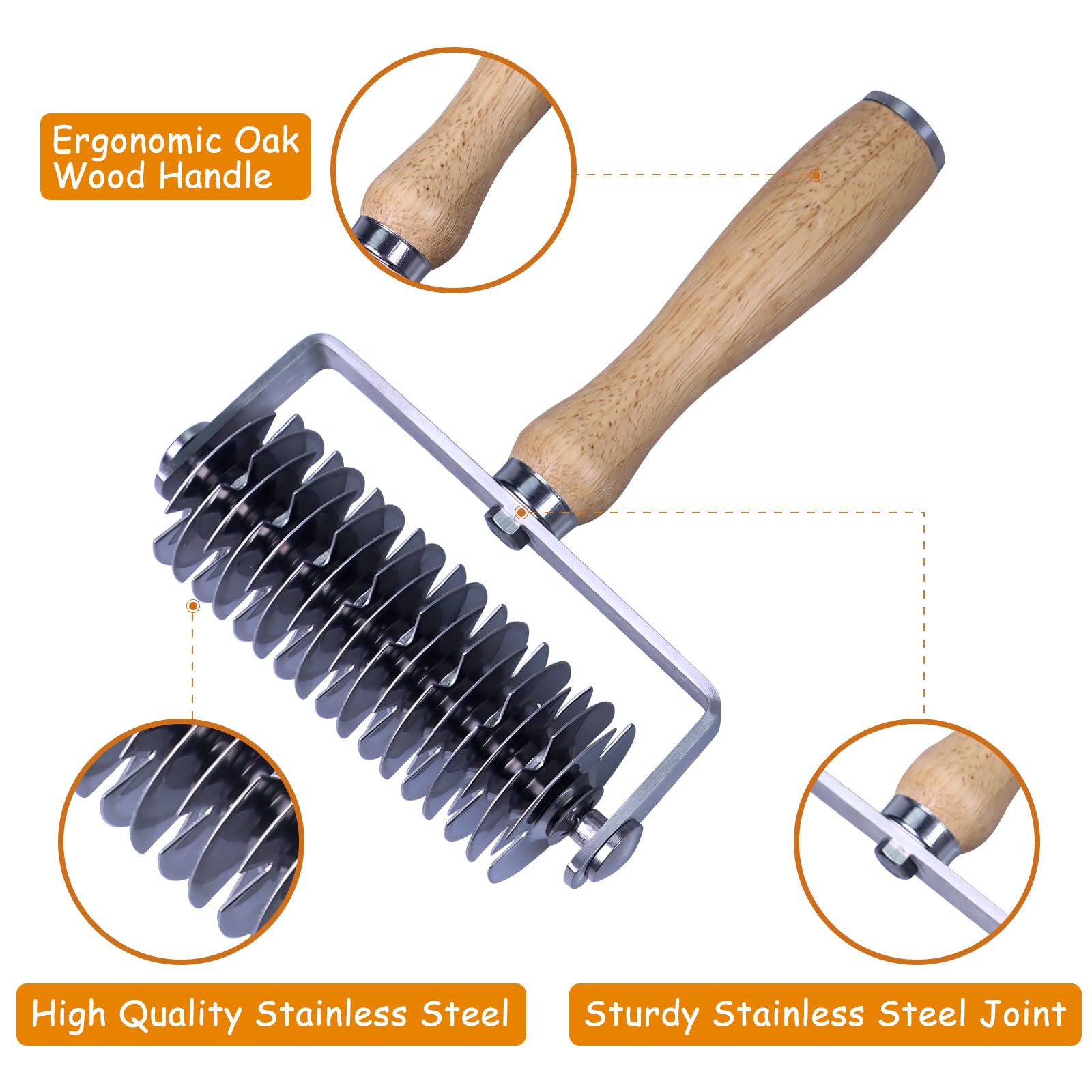 - š„§ćBETTER QUALITYćā The roller is made of durable stainless steel, making it easier to cut through dough and ensuring longevity and consistent performance. The Handle is made from Oak wood and shaped ergonomically to provide comfortable grip and control.