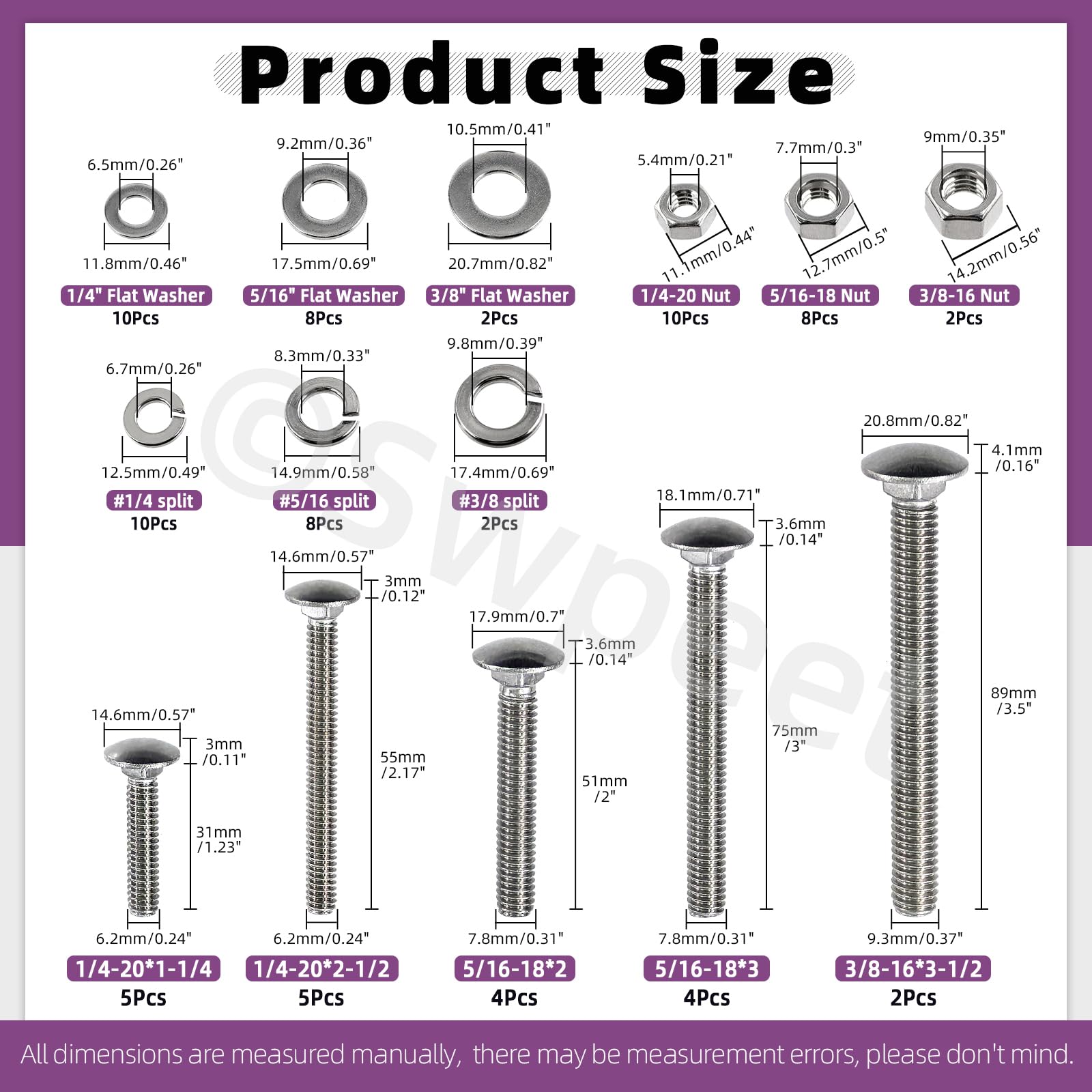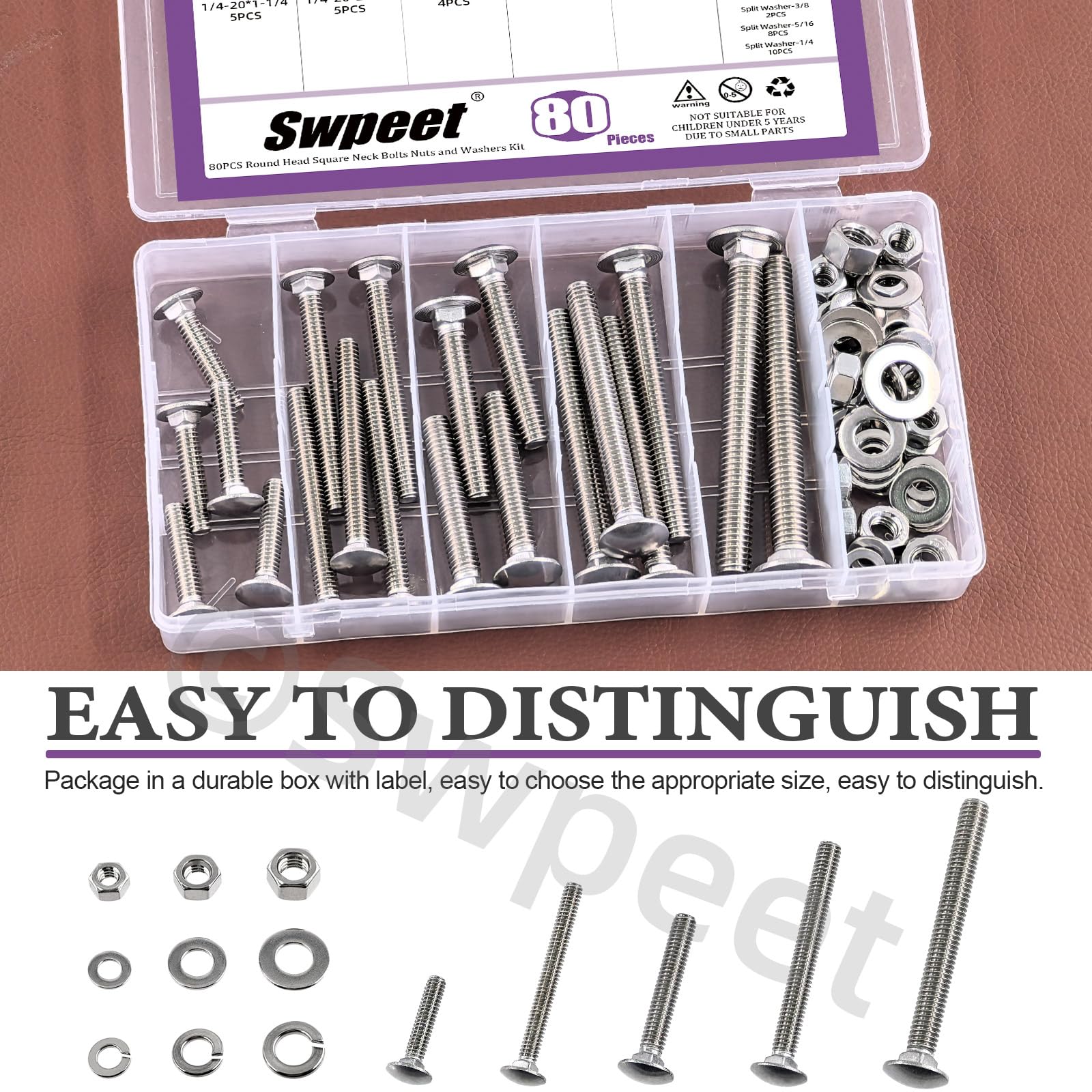 Details: 👑 Swpeet 80Pcs 5 Sizes 1/4", 5/16", 3/8", Carriage Bolts Screws Nut Washer Assortment Kit, 304 Stainless Steel Round Head Square Neck Screws, Full Thread Carriage Bolts, Hex Nuts, Flat/Lock Washers