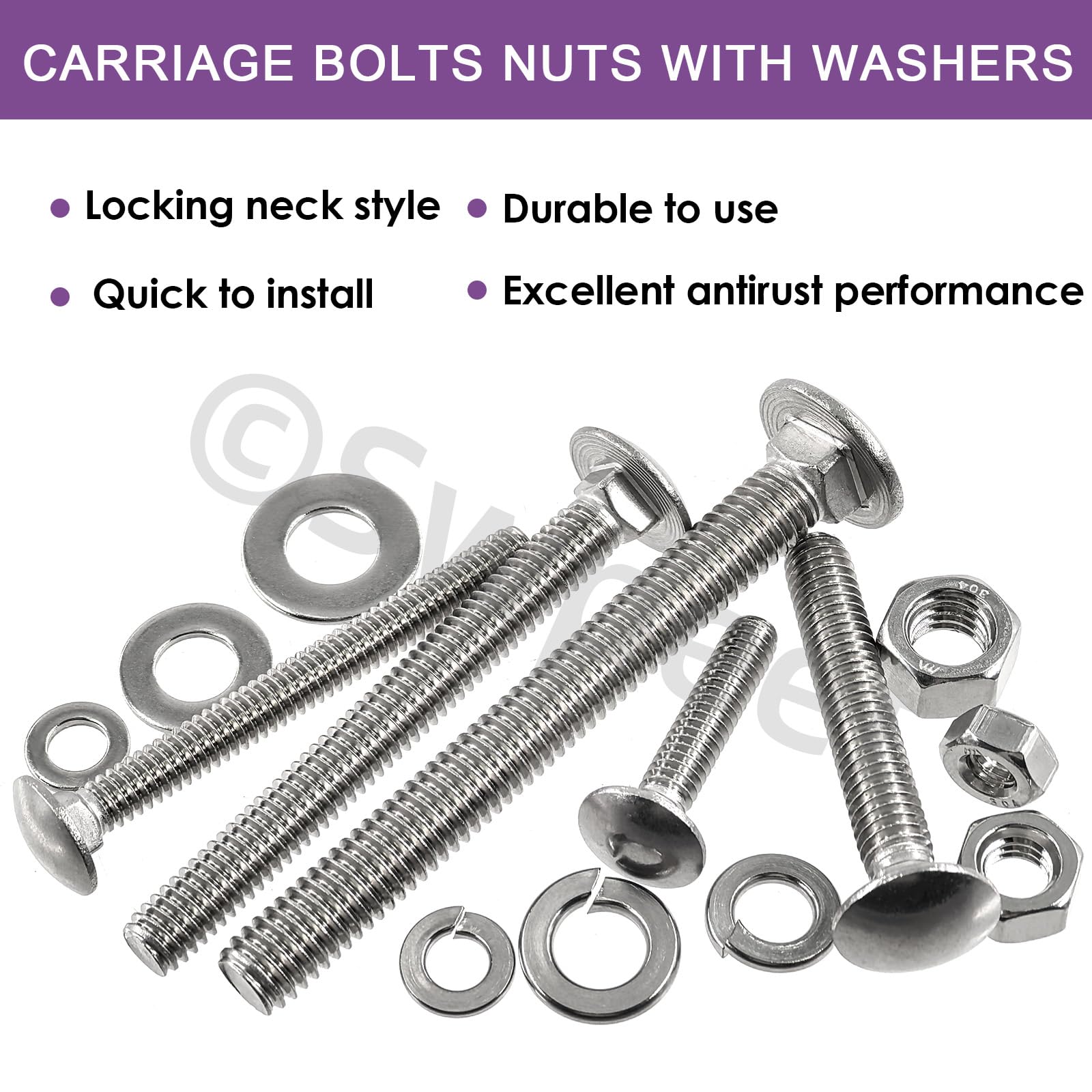 - 🎯 High Quality ------ Made of 304 stainless steel, these carriage bolts, nuts, and washers are highly resistant to corrosion and rust. Suitable for both indoor and outdoor use, even in harsh environments. Well manufactured, standard-sized, without burs, smooth surface, precise and clean threads. Can be used for a long time.