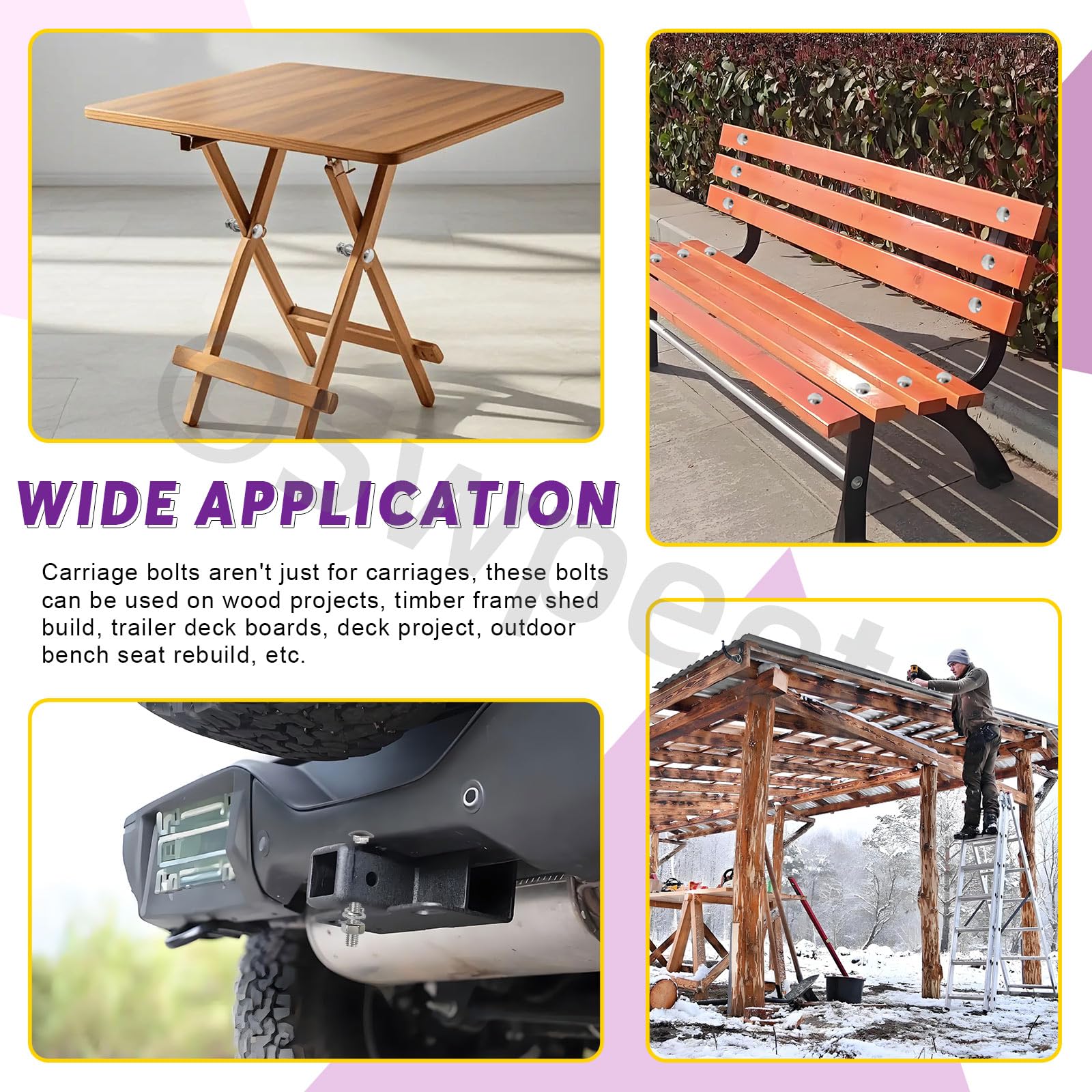 - 🎯 Wide Applications ------ This kit is versatile and can be used in various industries. These bolts can be used on wood projects, carriages, timber frame shed build, trailer deck boards, deck project, outdoor bench seat rebuild, etc. Also applied in home appliances, communication equipment, and ship assembly and more. A must-have kit for professionals and DIY enthusiasts.
