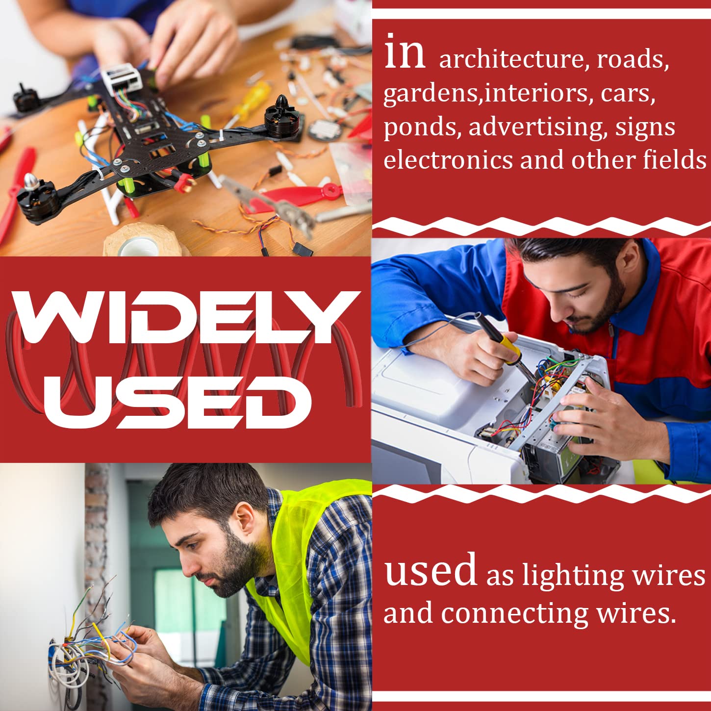 - [Wide Compatibility] Electrical wire widely used in monochromatic LED strips, model cars, marine, low voltage cables, light bulbs, power/ground for indoor lighting, low loss home appliances or car audio installations, etc. A variety of wire sizes are available, such as wire gauge: 16/14/12/18/20 AWG, Length:100FT、120FT、150FT.