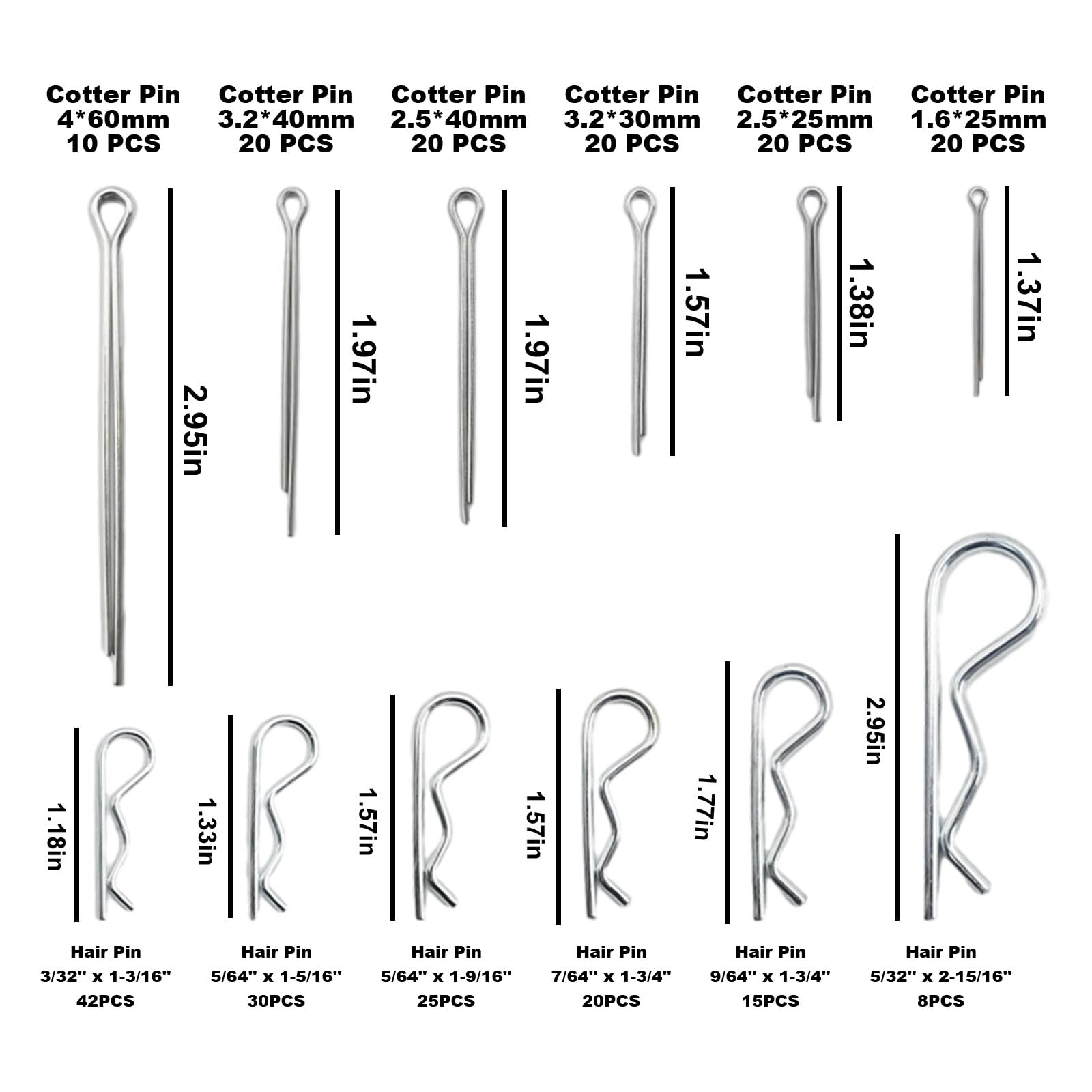 - Comprehensive Set with Ample Quantities:The kit includes 250 cotter pins of different sizes and types, providing versatility for a wide range of applications. With a detailed breakdown of sizes, including cotter key and hairpin cotter pins, you have everything you need for various repair and maintenance tasks.