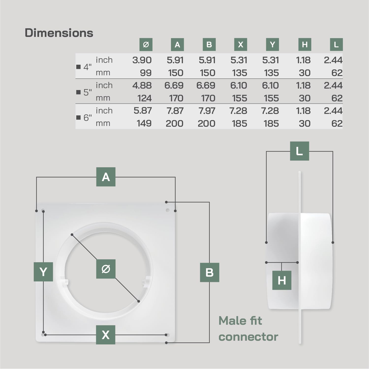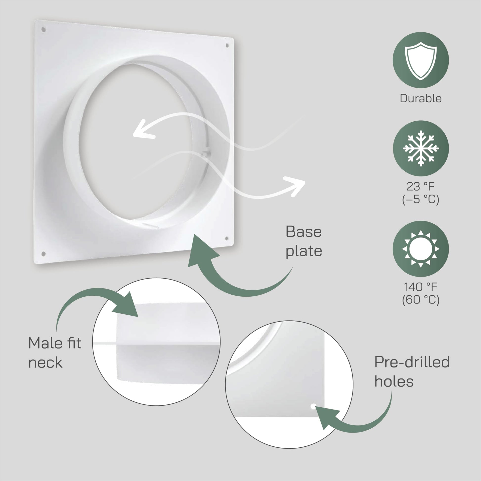 - FITS 6" INCH / 150MM DUCTS: Duct connector flange with both male fittings diameter of 5.87" inches / 149mm and insertion depth of 1.18" / 30mm. Plate dimensions are 7.87" x 7.87" / 200 x 200mm. Screw hole spacing is 7.28" x 7.28" / 185 x 185mm. Easily will fit with any plastic pipes for HVAC.