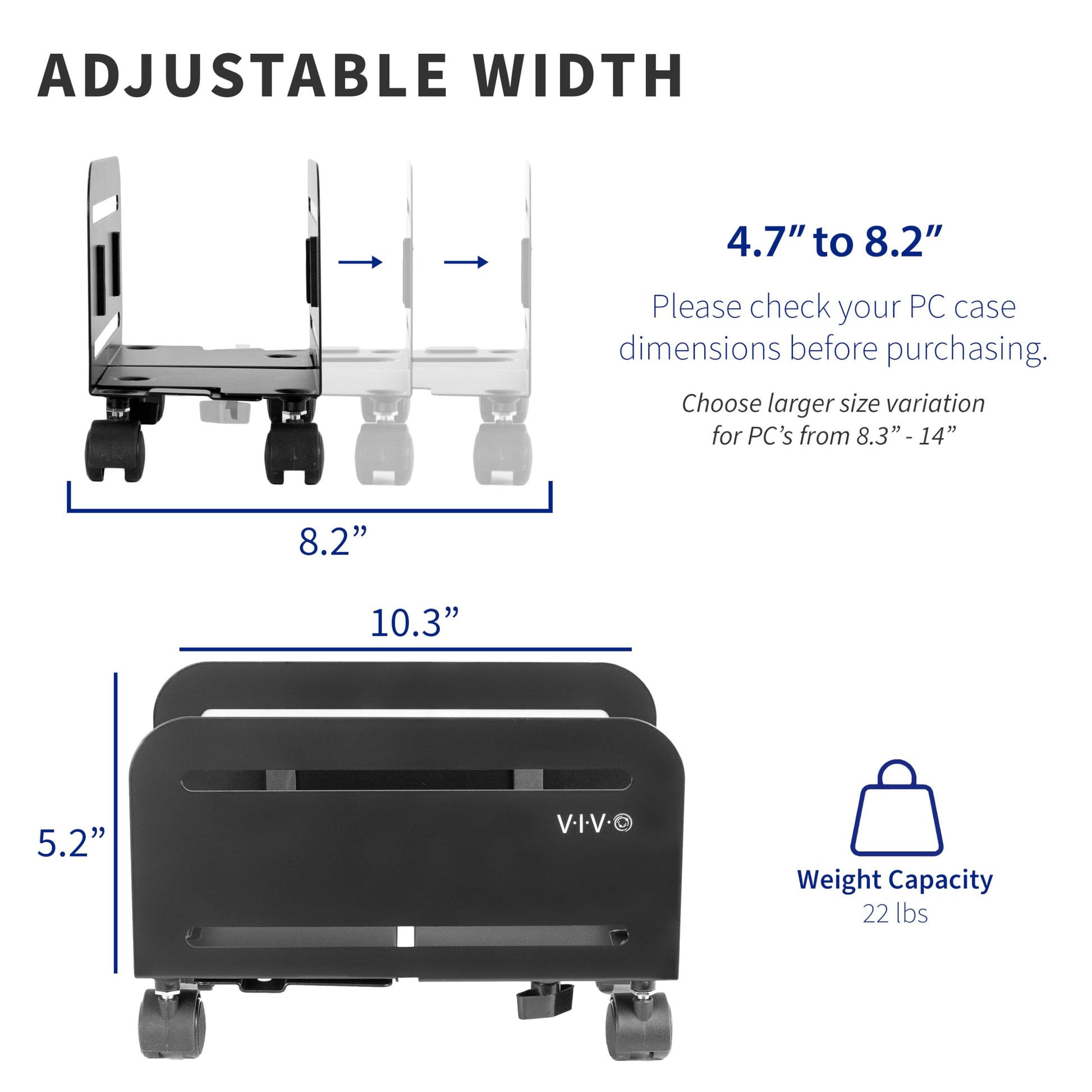 - Fits 4.7" to 8.2" Wide PCs: Cart is adjustable from 4.7” to 8.2” allowing it to accommodate most ATX cases on the market. Note: Please check your PC case dimensions before purchasing to ensure that the width does not exceed 8.2"