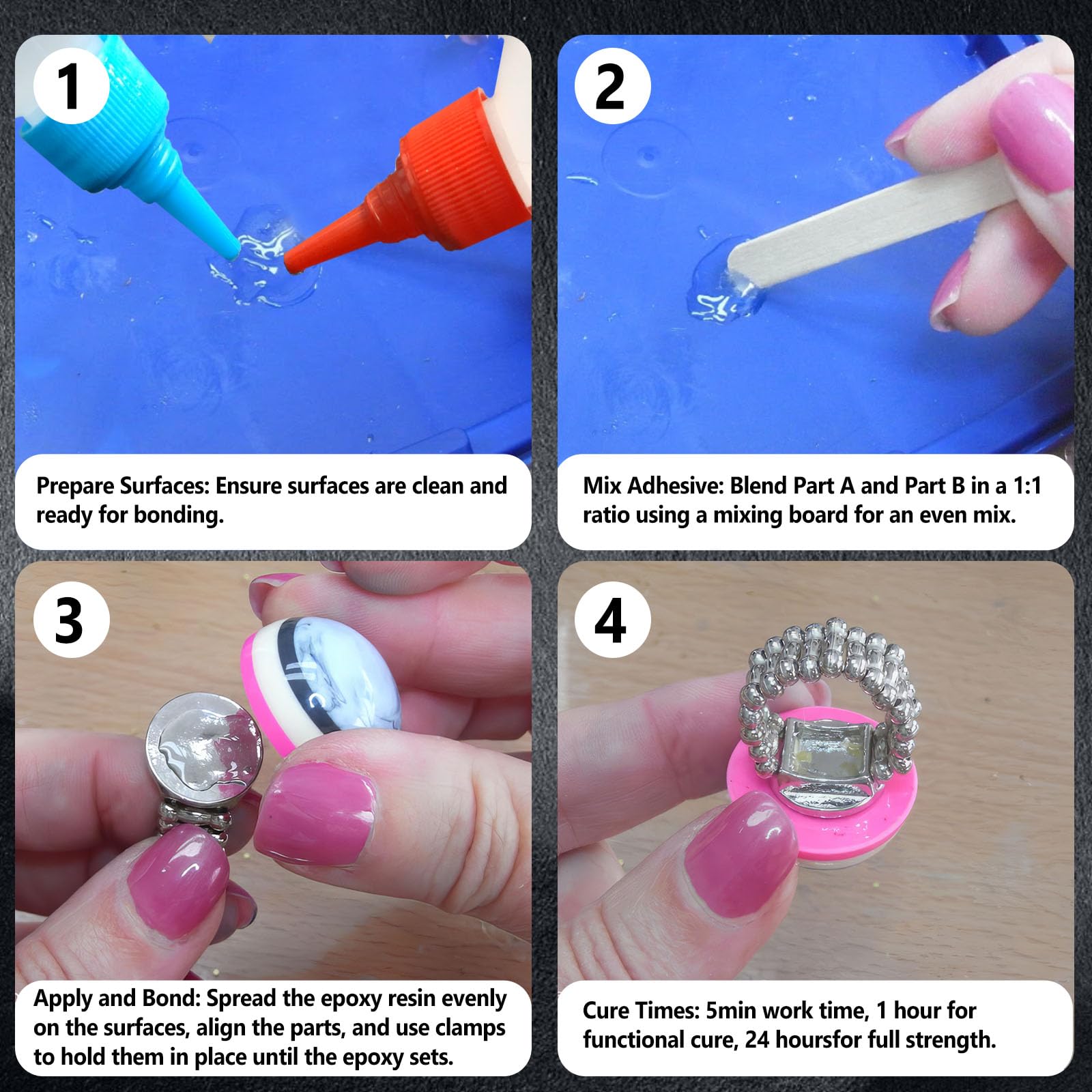- Easy to Use: Clean and prepare the surface to be bonded. Mix Agent A and Agent B in a 1:1 ratio. Apply the mixed epoxy resin evenly to the surface to be bonded within 5 minutes. Align and bond the parts, and use a clamp to fix if necessary. Once cured, it offers an extremely strong and long-lasting hold on various materials