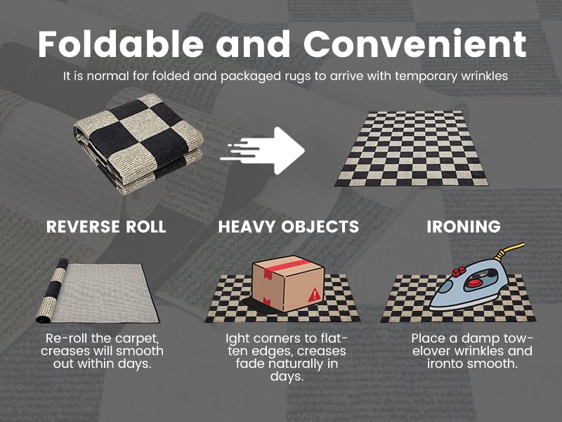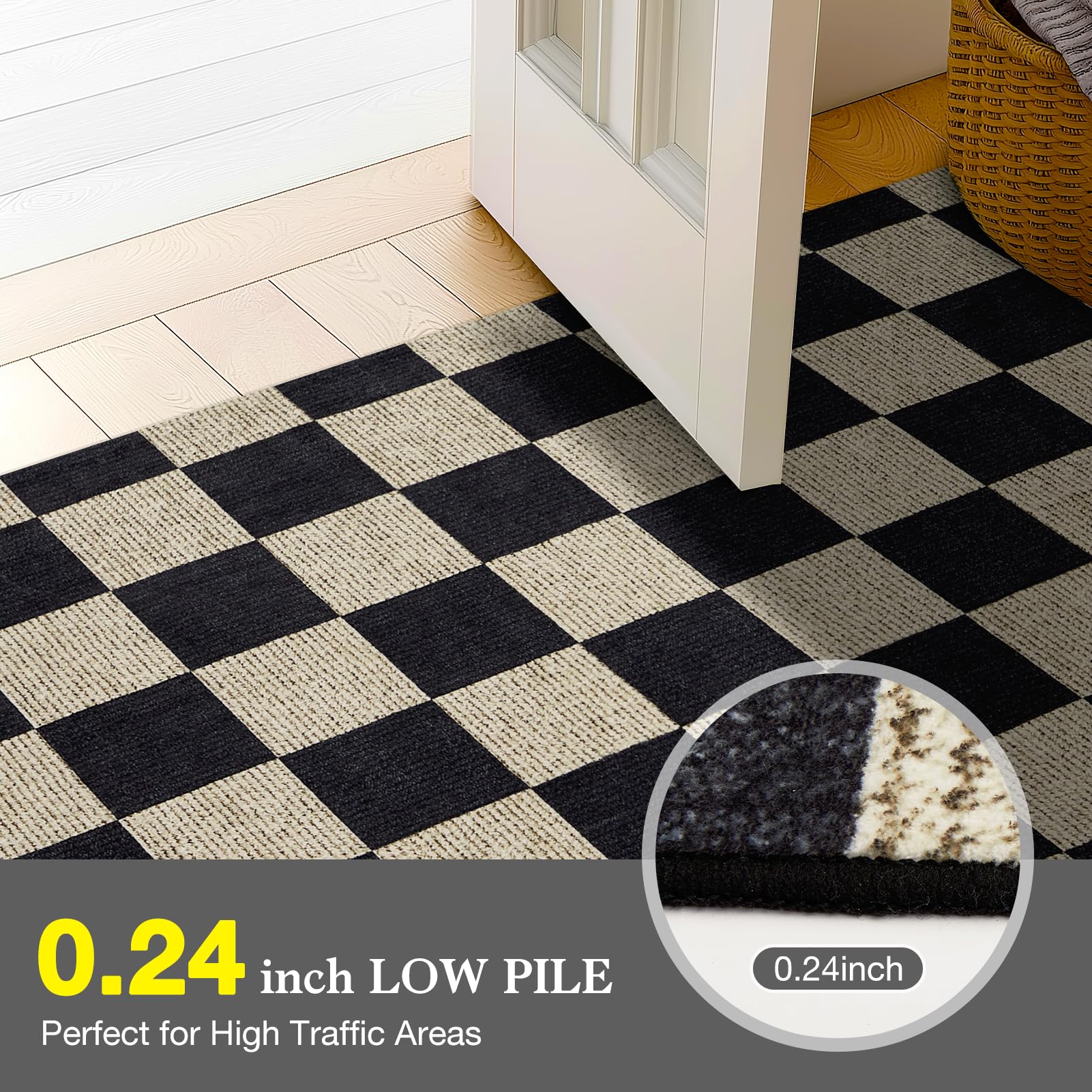 - 【Low Pile & Non-Slip Rug】Our checkered rugs feature non-slip rubber + thread backing to ensure no slips or trips, perfect for laminate and hardwood floors, no need for additional rug pads. The pile thickness of our rugs is only 0.24 inches (about 6 mm), which will not hinder the door gap