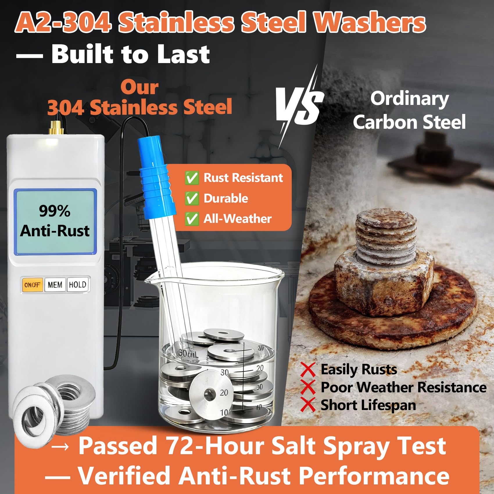 - 🏆 ELIMINATE RUST & CORROSION FOREVER - PREMIUM 304 STAINLESS STEEL: Stop replacing rusty, weakened washers! Forged from 18-8 (304) stainless steel, our washers boast exceptional resistance to water, chemicals, salt, and extreme temperatures. Ideal for automotive undercarriages, marine applications, and outdoor equipment, they provide a permanent, corrosion-proof solution that outlasts cheap zinc or carbon steel alternatives.