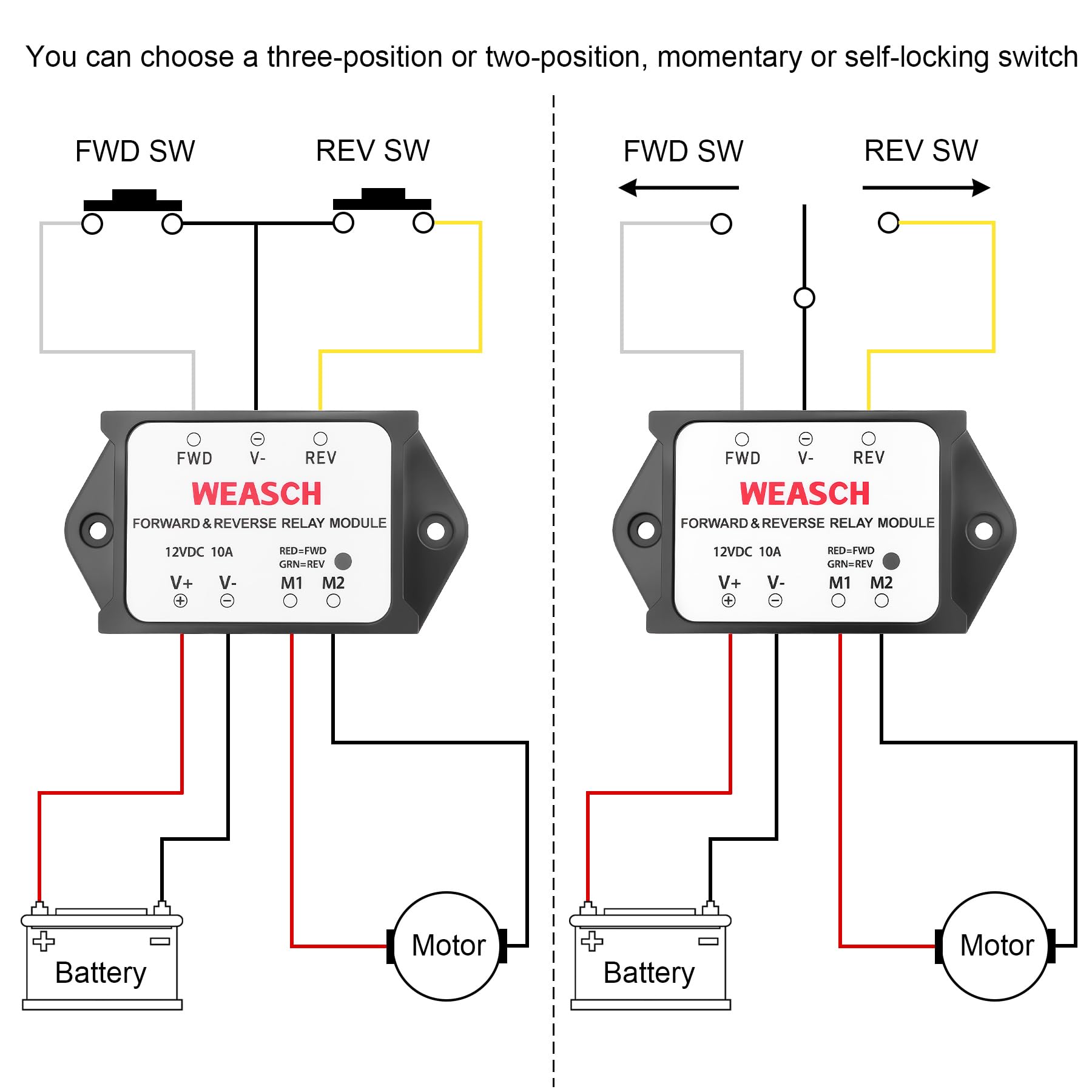 - This reversing relay module adopts a pre-wired design, and the wires are connected in different colors, which is easy to distinguish and connect. Control line (White, Black, Yellow) 20AWG Output line (Red, Black) 16AWG