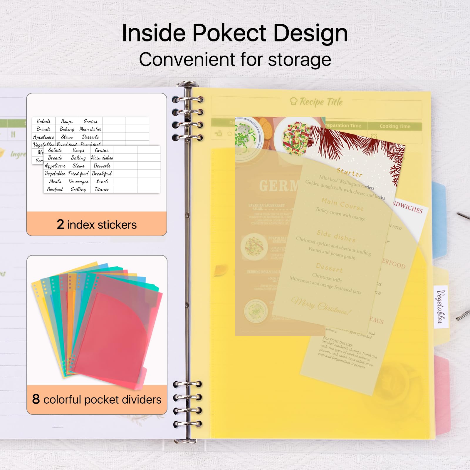 - CREATIVE POCKET DIVIDER & INDEX STICKER: It provides 8 colorful dividers for different types of recipes. The separation page is designed with a pocket, which can store food photo cards. There are also 60 index stickers for pasting on divider pages as index for recipe types (36 pre-printed, 24 blank custom). You can quickly find the recipe you want through your DIY cookbook.