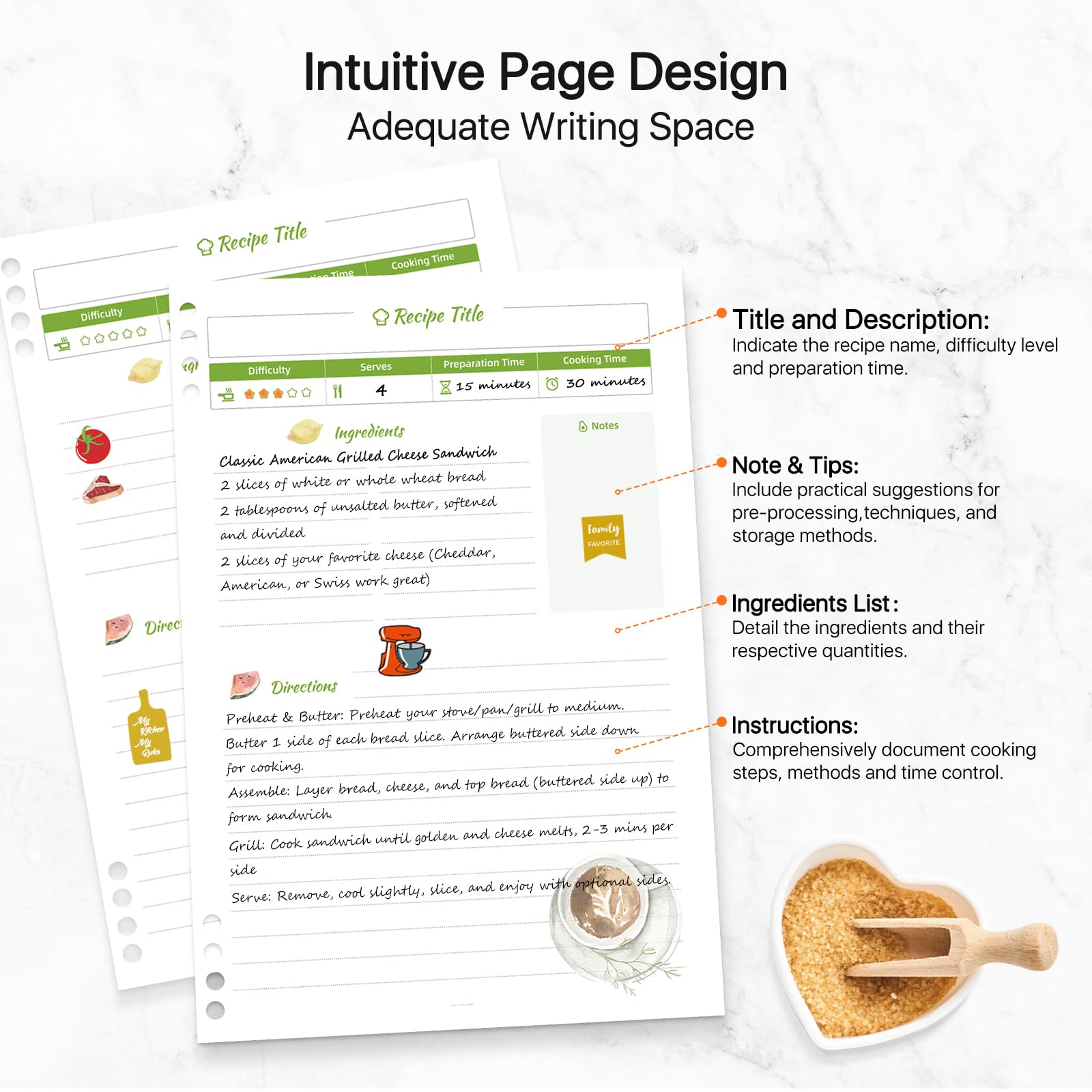 - ORGANIZE AND COLLECT YOUR OWN RECIPES: As a personalized recipe book, you can write a total of 272 recipes, with enough space to record all your favorite recipes. You can easily take out or add the recipes you want from the binder ring, so as to customize the cookbook to meet your needs. This not only makes your cooking experience more organized but also becomes a wealth for future generations.