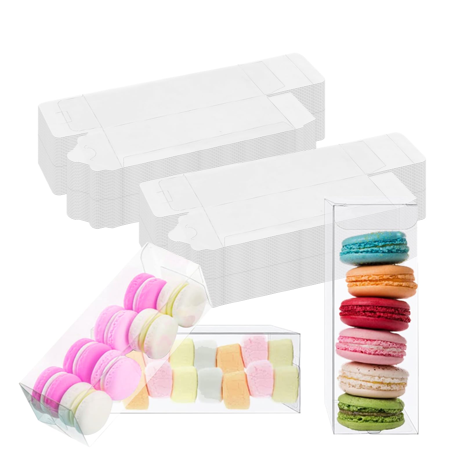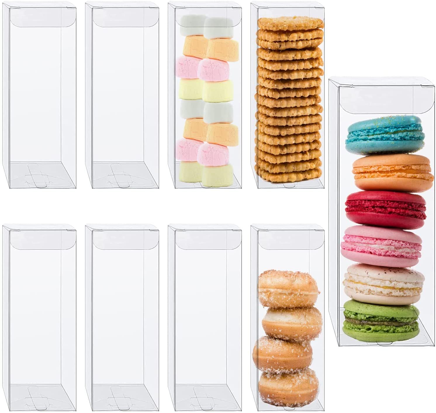 - Macaron Boxes Package and Size: You will get 50 pieces of clear candy boxes, each measures 2*2*6 inches/5*5*15cm. The mini capacity makes them ideal for presenting beautiful food or gifts for a variety of occasions, including weddings, birthdays, and more.