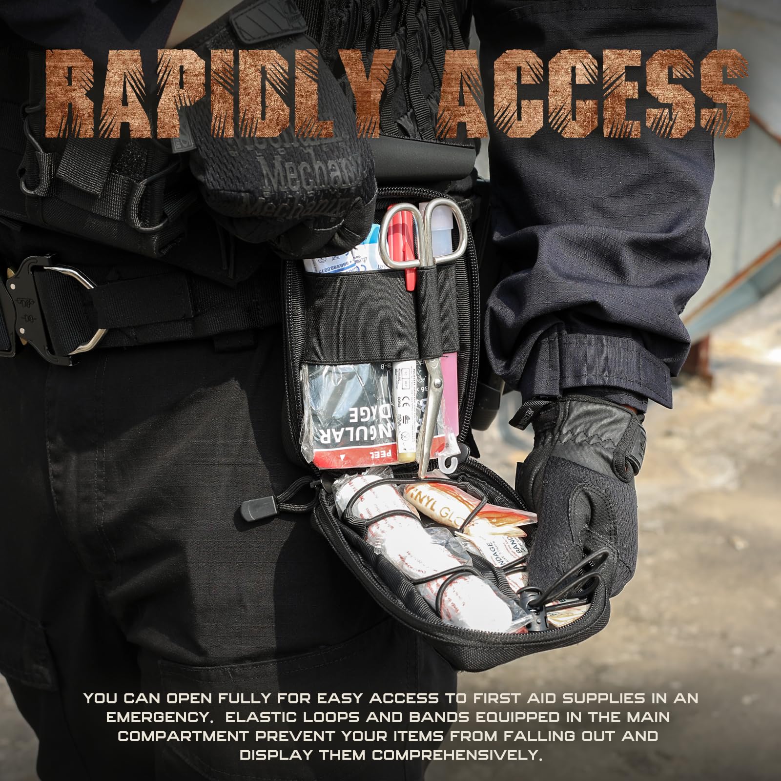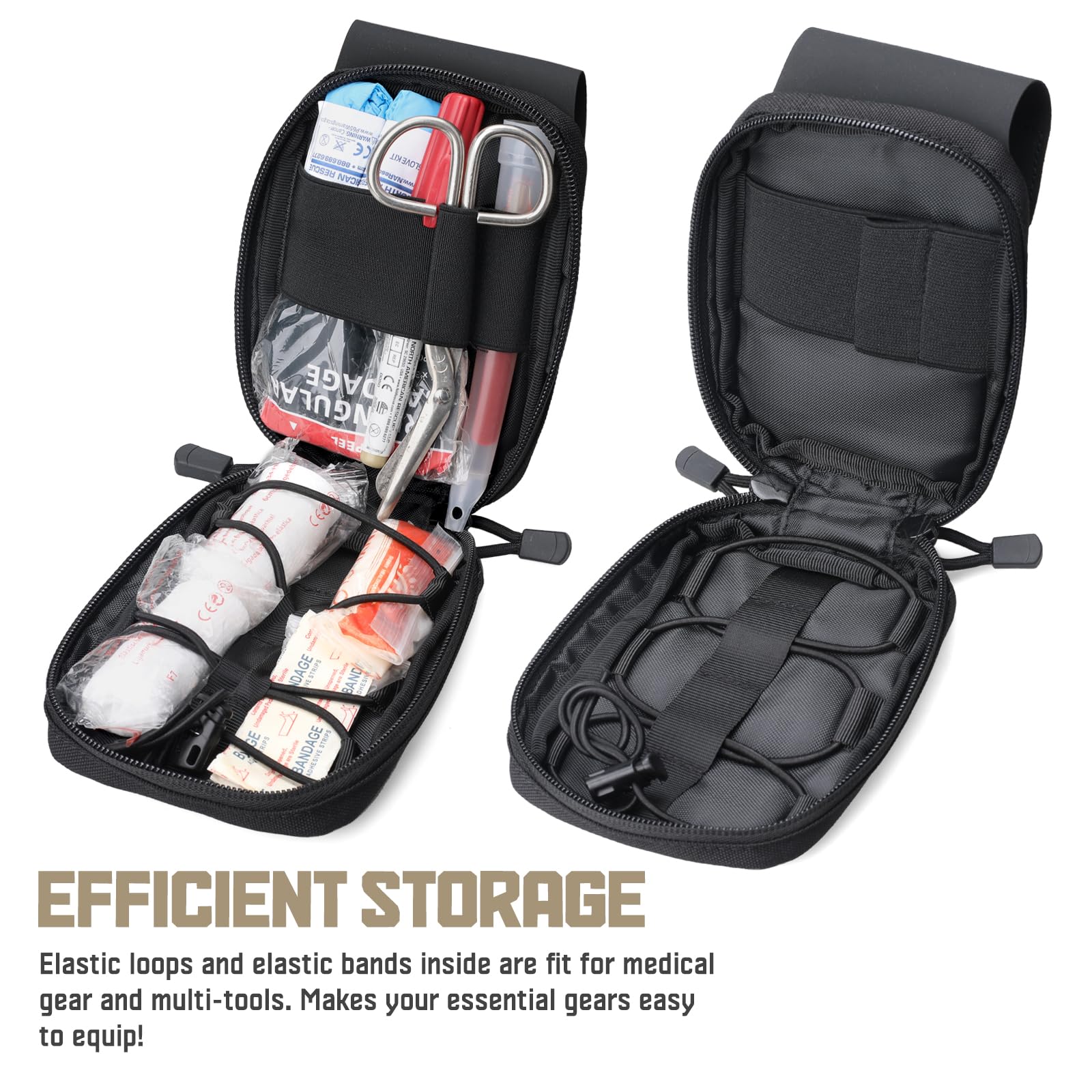 - SIMPLE & BASIC: IFAK Pouch adopts a minimalist interior design that contains three elastic bands and a detachable adjustable shock cord(with cord stop) to create 6 elastic retention loops for securing basic supplies in place, keeping different items stable to avoid clutter.