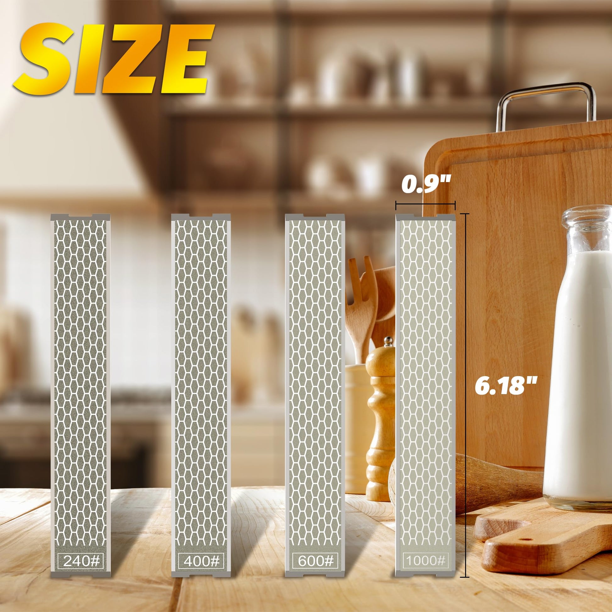 - Grit Range: Measuring at 23×7×156mm each, the aluminum base set comprises 4 different grits: 240#, 400#, 600#, 1000#, covering a wide range of sharpening needs. Whether you're looking to restore a severely dull edge or refine an already sharp one, these stones offer the grit variety necessary for the task at hand.
