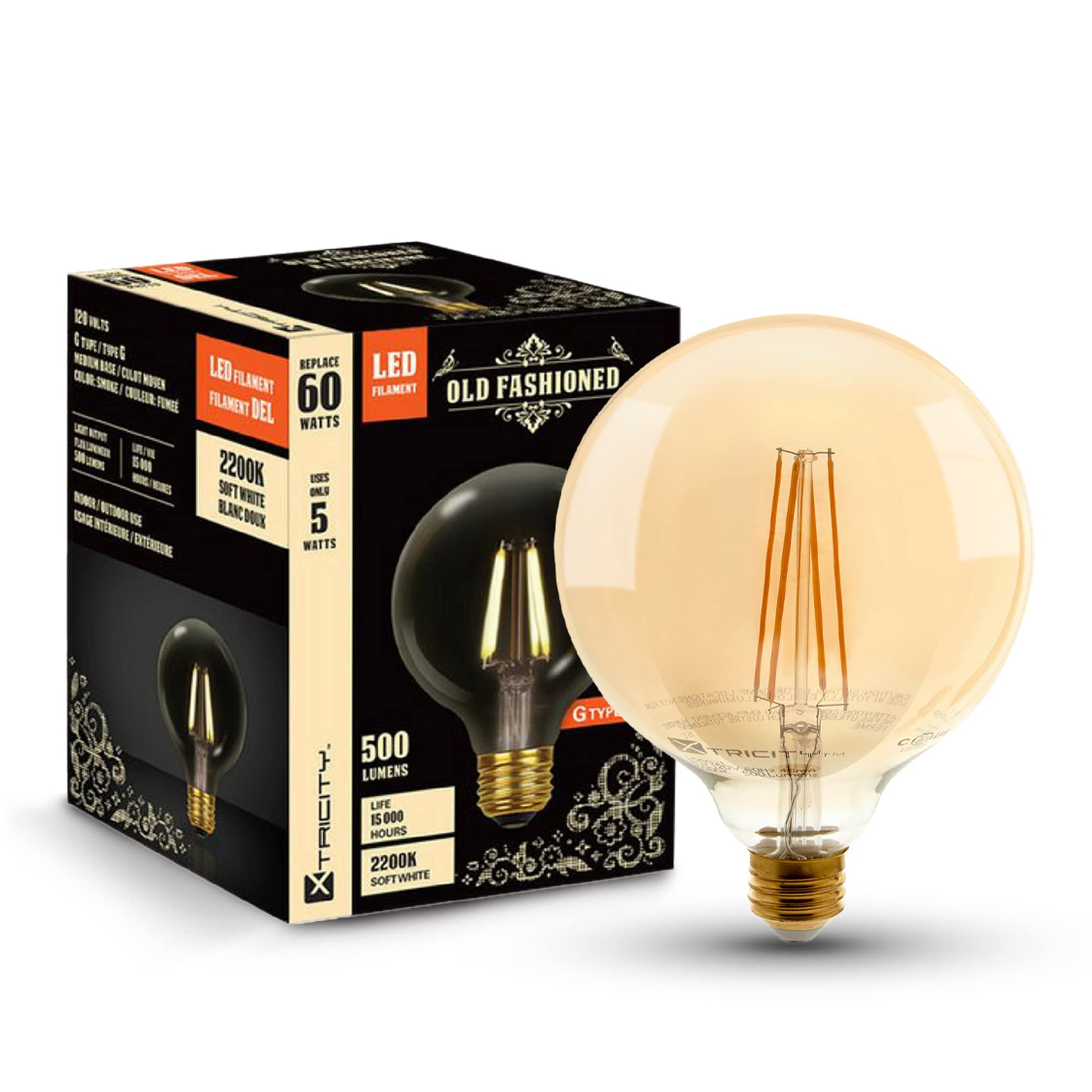 Details: Combining the classic vintage look of a globe Edison-style bulb with LED technology, these Xtricity G40 bulbs are sure to create that old-fashioned atmosphere you desire β while reducing energy consumption. Using a standard E26 screw base, these vintage LED bulbs are ideal for decorative lighting fixtures, replicating the look and feel of traditional incandescent bulbs. With a lifespan of up to 15,000 hours, these LED bulbs are sure to reduce the upkeep needed to maintain your vintage-style fixtures. With a soft white color temperature of 2200k, these LED bulbs create a warm and inviting ambiance β sure to compliment any restaurant, kitchen, office, or living room aiming for a nostalgic look and feel. Create the perfect steampunk dΓ©cor with these dimmer compatible, flicker-free, smoked LED bulbs.