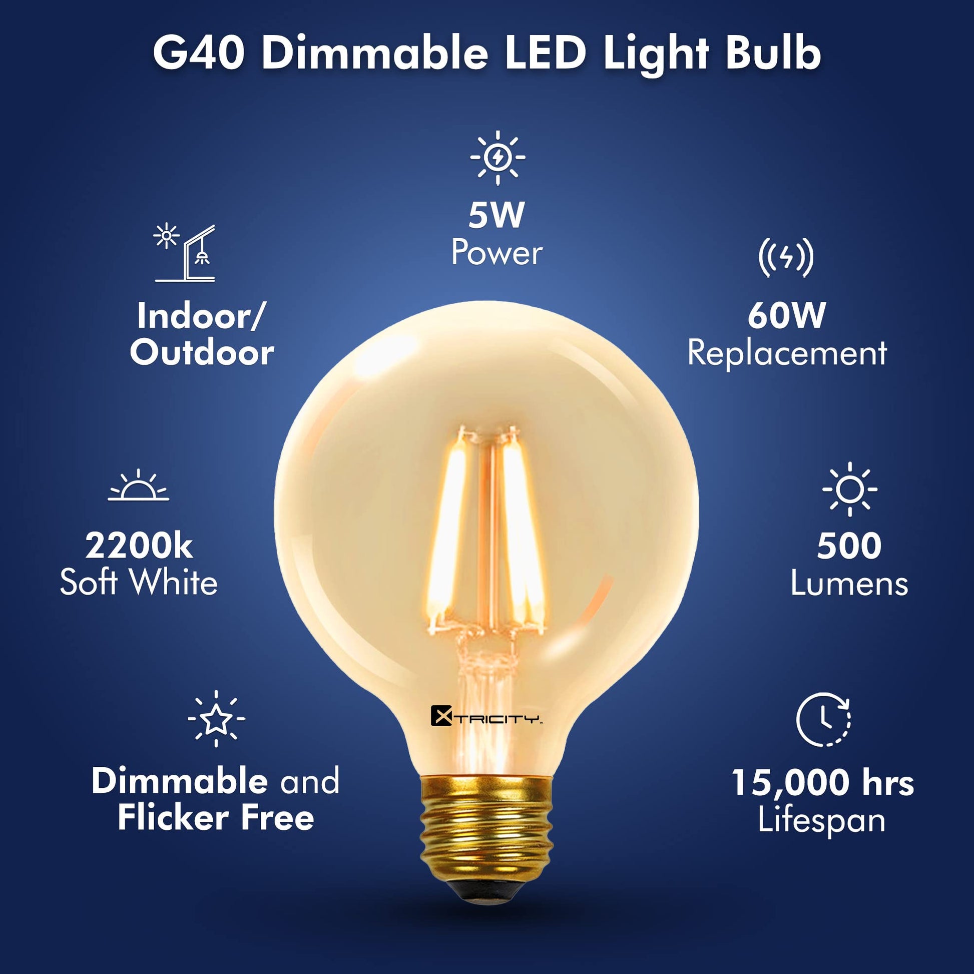 Xtricity Dimmable LED Filament G40 Vintage LED light bulb, Edison Style,5W (60 Watt Equivalent), E26 Medium Base, 2200k round led light bulbs, 500 Lumens, Ideal for String Lights and Vintage Lighting
