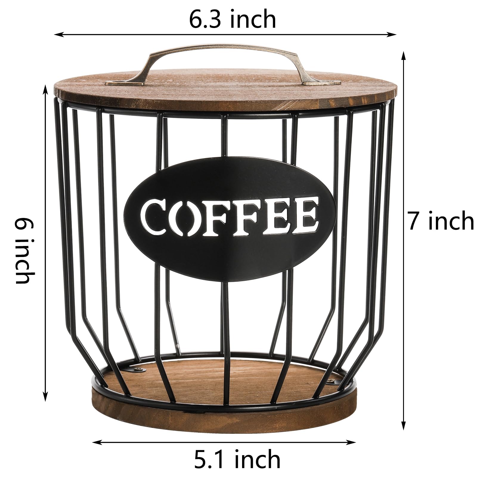 - Yarlung black wire coffee pod holder with rustic wooden lid and base, wide mouth 6.3"D x 7"H, 5.1inch base, take up less countertop area to organize coffee pods, coffee filters and more.
