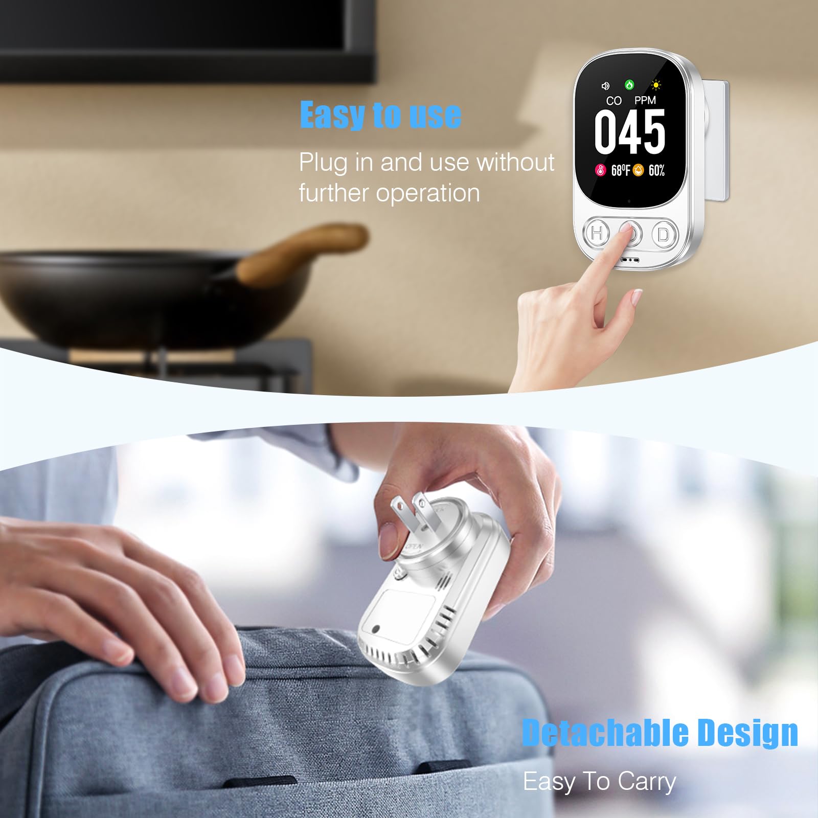 - 【Portable & Energy-Saving】Compact and travel-friendly (3.39 x 2.72 x 2 in, 0.15 lb), this plug-in carbon monoxide detector fits easily into your bag or suitcase. With low power consumption (≤2W), it runs efficiently at about $0.17 per month. Perfect for reliable protection at home, office, or on the go.(Note: The plug adapter is detachable and must be securely locked during use).
