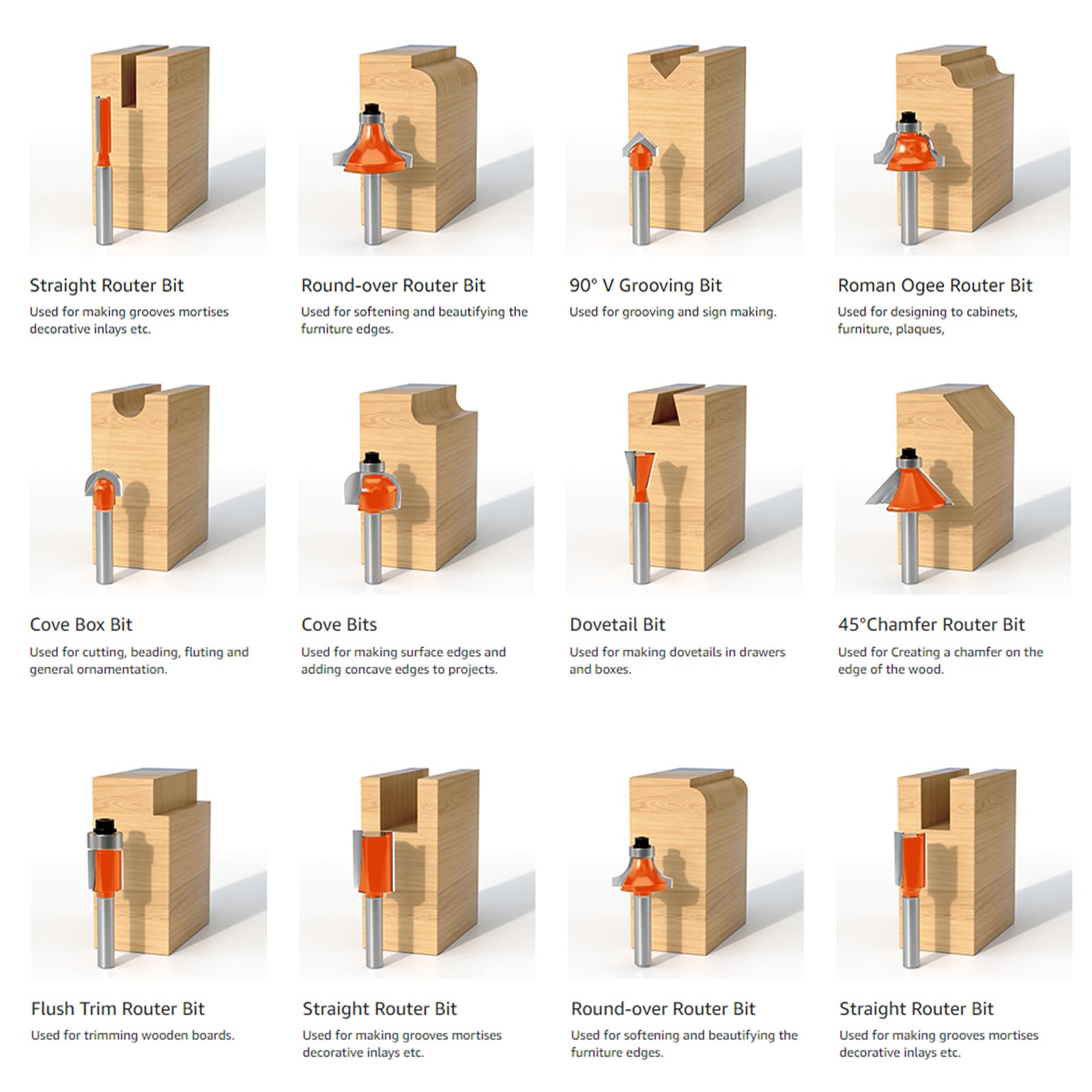 - [Quality materials] Achieve clean and accurate cuts on all types of wood with our router bits, thanks to precisely machined C3 tungsten carbide blades that offer excellent resistance to heat.Our router bits are built to last, with hardened solid alloy steel construction and a powder coating finish that ensures durability and longevity.