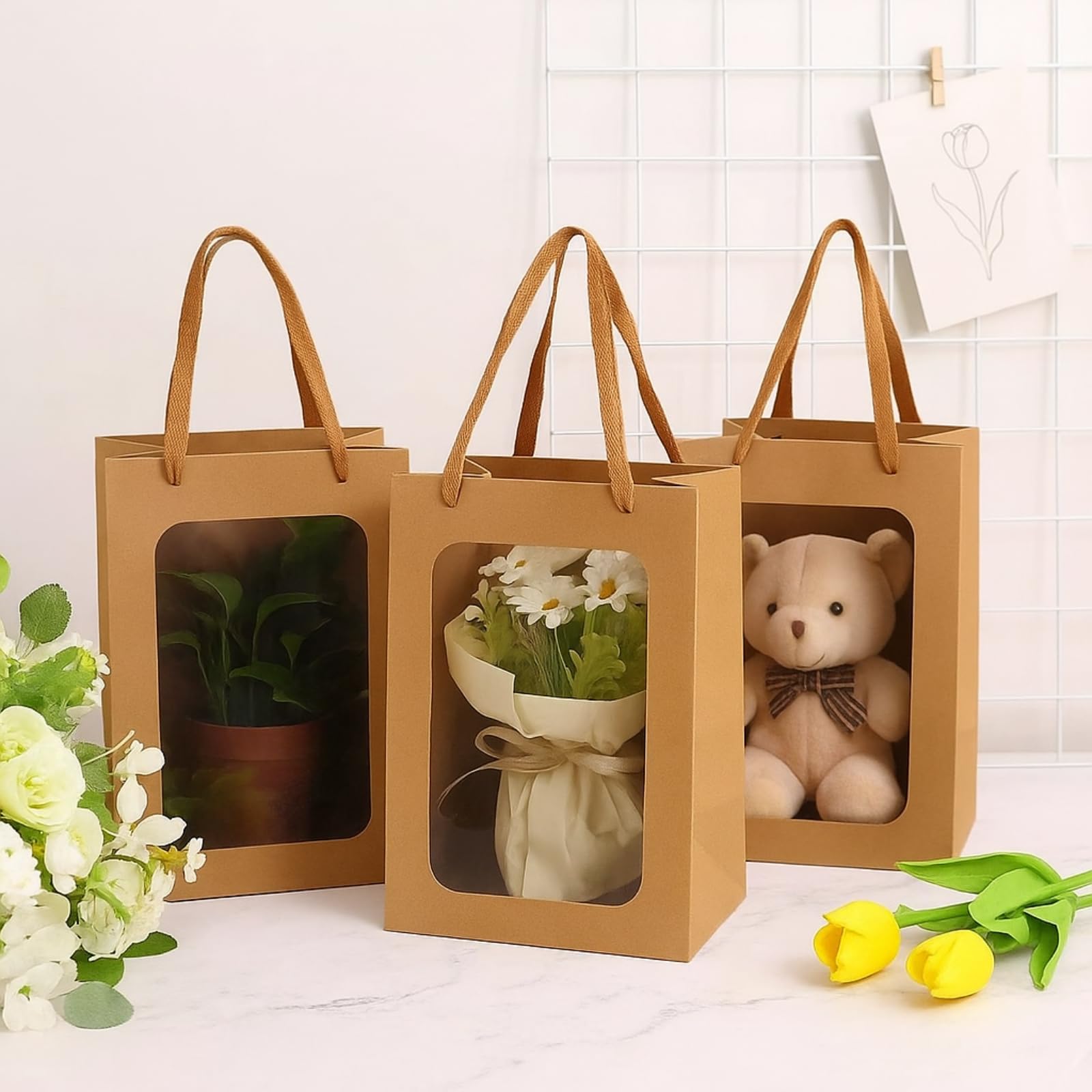 - What You Will get: our product include 30 packs brown gift bags with handles and clear window, enough quantity for you to use and have replacement. They are also great gift choice for your friends and family! This tote paper bag measures 9.8''H x 7''L x 5''W, suitable for you to place all kinds of gifts.