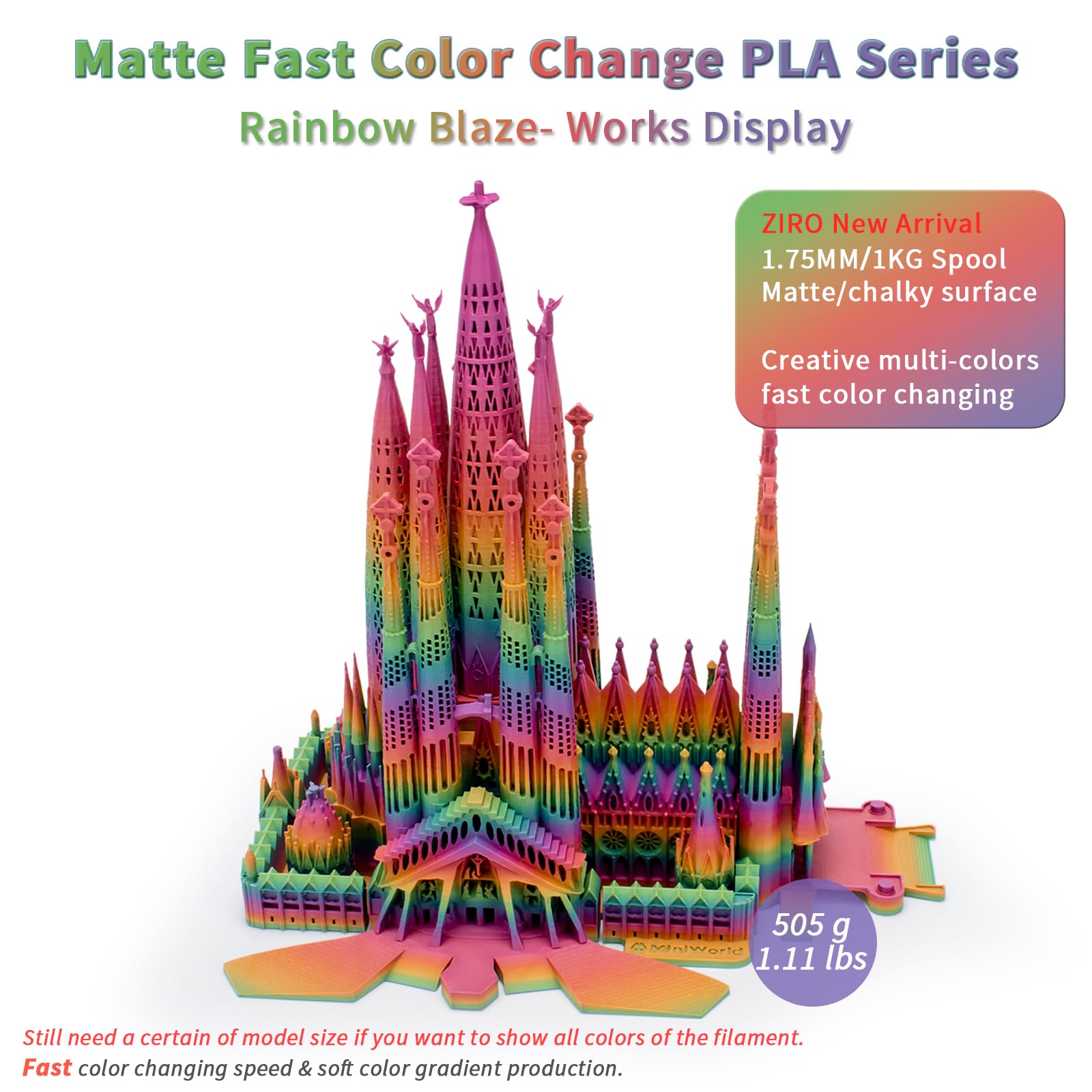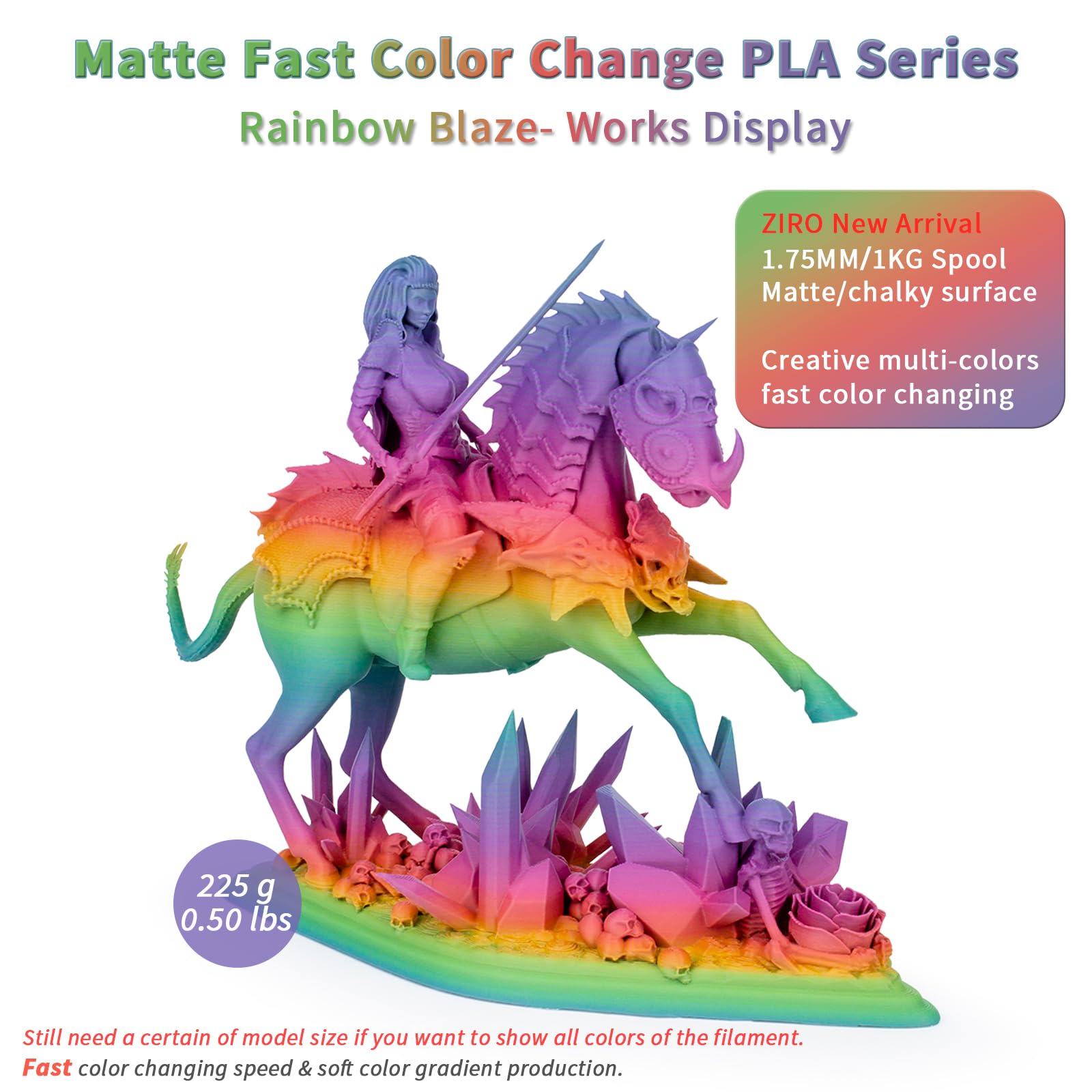 - [Fast Color Change Matte PLA]- The ZIRO "Rainbow Blaze" combined multiple colors in one matte pla filament. Higher-cost production technology to achieve the true faster color changing aim. The matte surface offers a no shine look, giving your 3D works a unique style.
